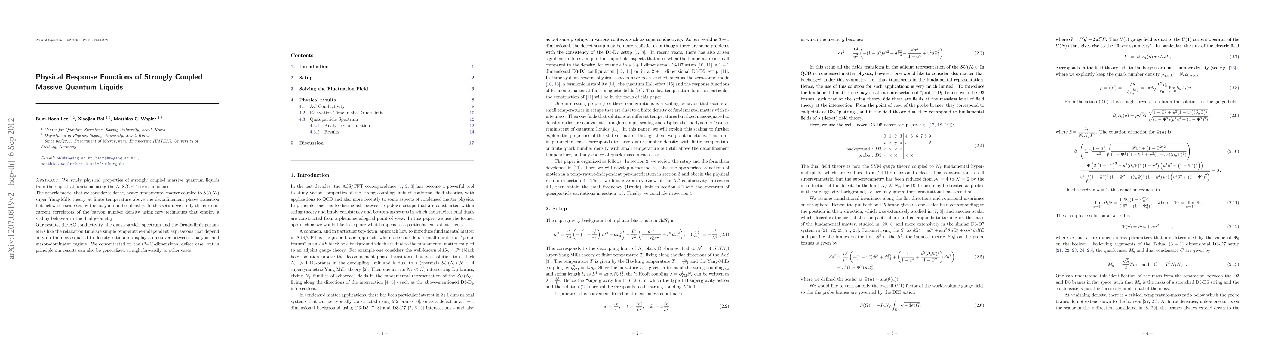 We study physical properties of strongly coupled massive quantum liquids from their spectral functions using the AdS/CFT correspondence. The generic model that we consider is dense, heavy fundamental matter coupled to SU(N_c) super Yang-Mills theory at finite temperature above the deconfinement phase transition but below the scale set by the baryon number density. In this setup, we study the current-current correlators of the baryon number density using new techniques that employ a scaling behavior in the dual geometry. Our results, the AC conductivity, the quasi-particle spectrum and the Drude-limit parameters like the relaxation time are simple temperature-independent expressions that depend only on the mass-squared to density ratio and display a crossover between a baryon- and meson-dominated regime. We concentrated on the (2+1)-dimensional defect case, but in principle our results can also be generalized straightforwardly to other cases.