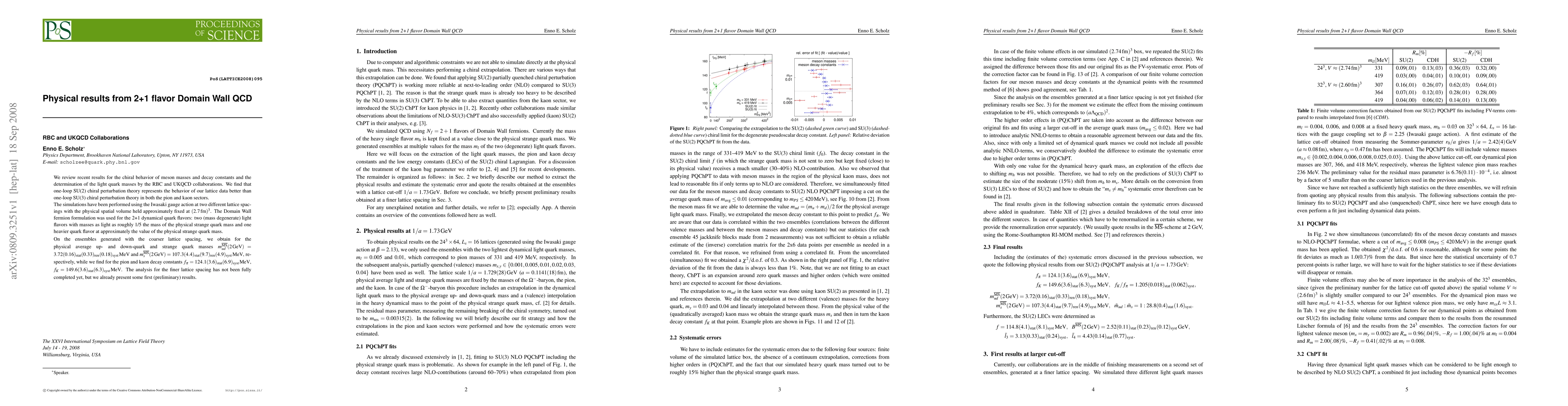 This paper reviews recent findings from 2+1 flavor Domain Wall QCD simulations, showing that one-loop SU(2) chiral perturbation theory better fits the lattice data than SU(3) in meson sectors. The study determined light quark masses and decay constants using the Iwasaki gauge action and found the average up- and down-quark masses to be 3.72 MeV and the strange quark mass to be 107.3 MeV.