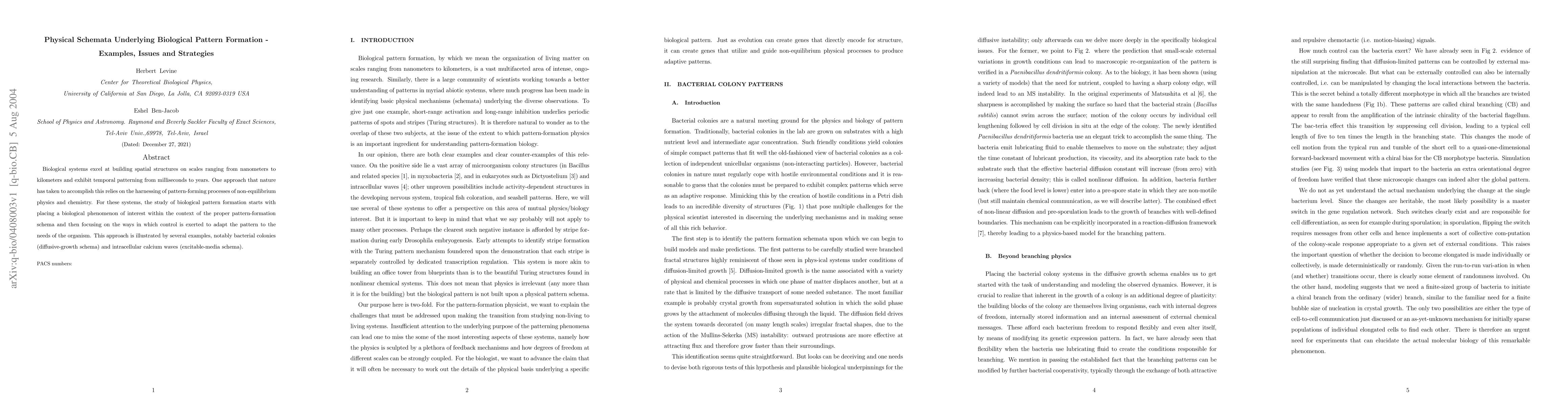 Studies of pattern formation in biological systems illustrate key examples such as bacterial colonies and intracellular calcium waves, offering insights into the underlying physical schemata.