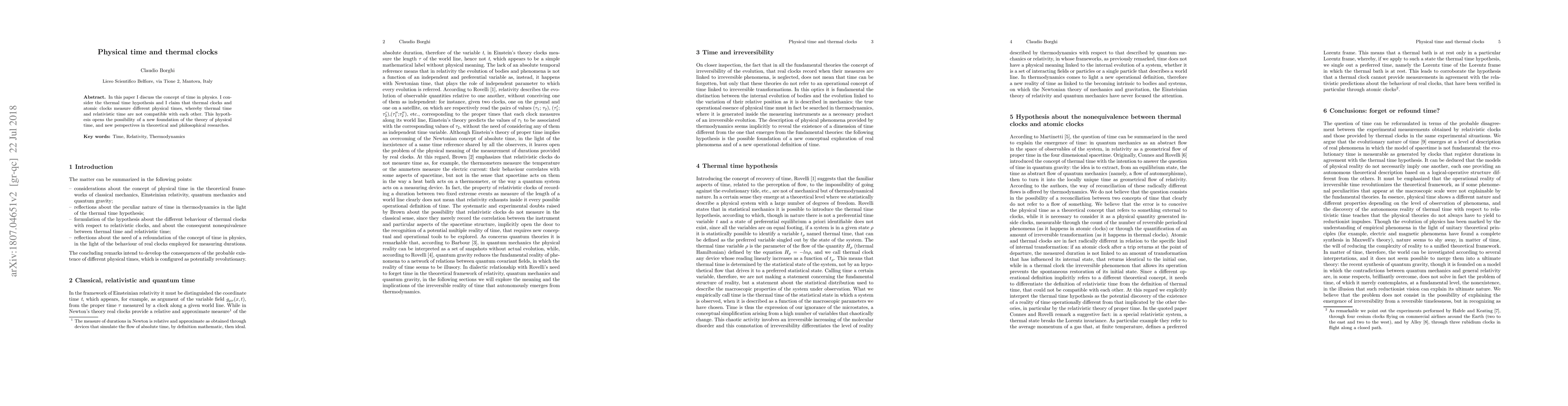 In this paper I discuss the concept of time in physics. I consider the thermal time hypothesis and I claim that thermal clocks and atomic clocks measure different physical times, whereby thermal time and relativistic time are not compatible with each other. This hypothesis opens the possibility of a new foundation of the theory of physical time, and new perspectives in theoretical and philosophical researches.