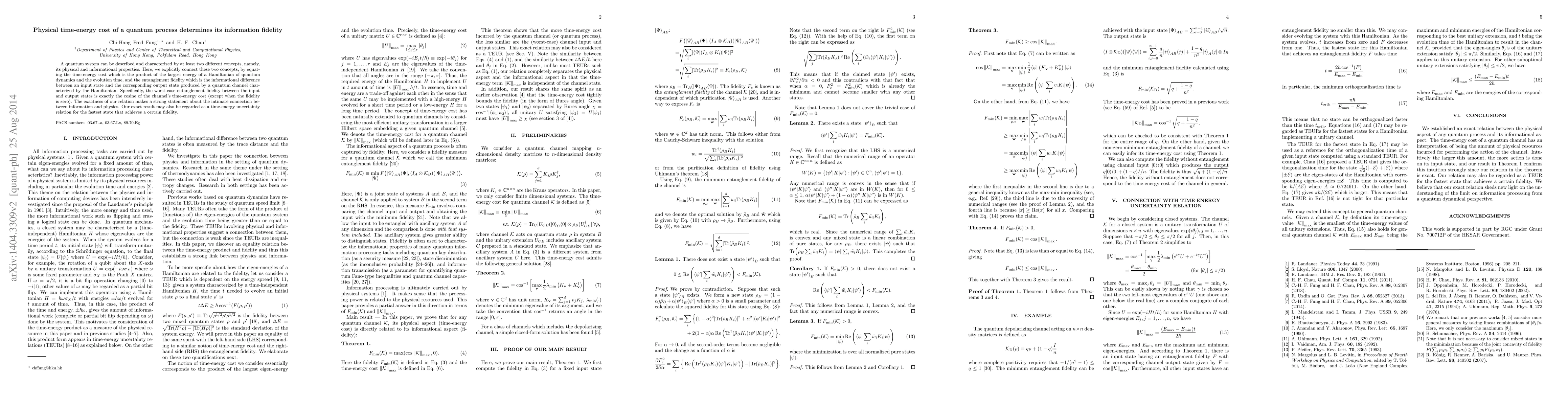 This paper establishes a precise relationship between the physical time-energy cost of a quantum process and its information fidelity, showing that the worst-case entanglement fidelity is the cosine of the channel's time-energy cost, highlighting the deep connection between quantum information and physical dynamics.