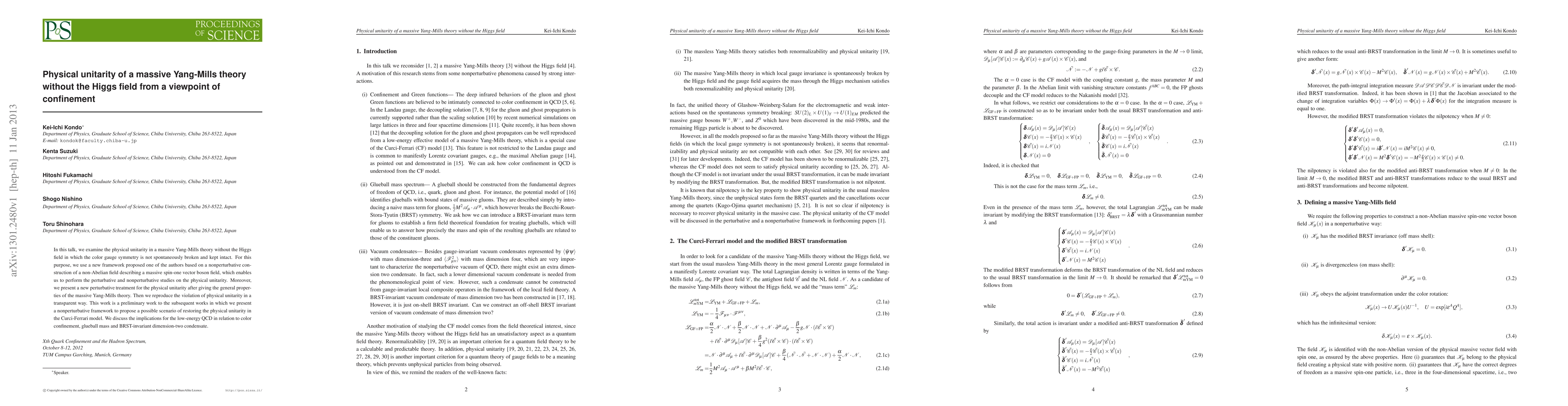 This paper explores the physical unitarity in a massive Yang-Mills theory without the Higgs field, maintaining unbroken color gauge symmetry. It introduces a new nonperturbative framework to study this unitarity, revealing its violation and laying groundwork for future work on restoring it in the Curci-Ferrari model, with implications for low-energy QCD and color confinement.