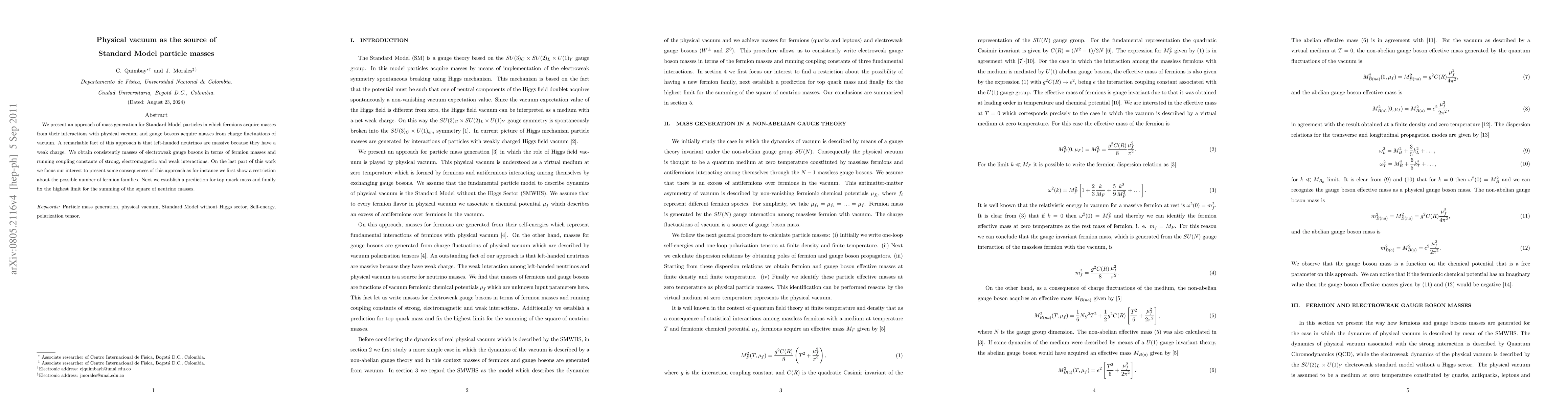 We present an approach of mass generation for Standard Model particles in which fermions acquire masses from their interactions with physical vacuum and gauge bosons acquire masses from charge fluctuations of vacuum. A remarkable fact of this approach is that left-handed neutrinos are massive because they have a weak charge. We obtain consistently masses of electroweak gauge bosons in terms of fermion masses and running coupling constants of strong, electromagnetic and weak interactions. On the last part of this work we focus our interest to present some consequences of this approach as for instance we first show a restriction about the possible number of fermion families. Next we establish a prediction for top quark mass and finally fix the highest limit for the summing of the square of neutrino masses.