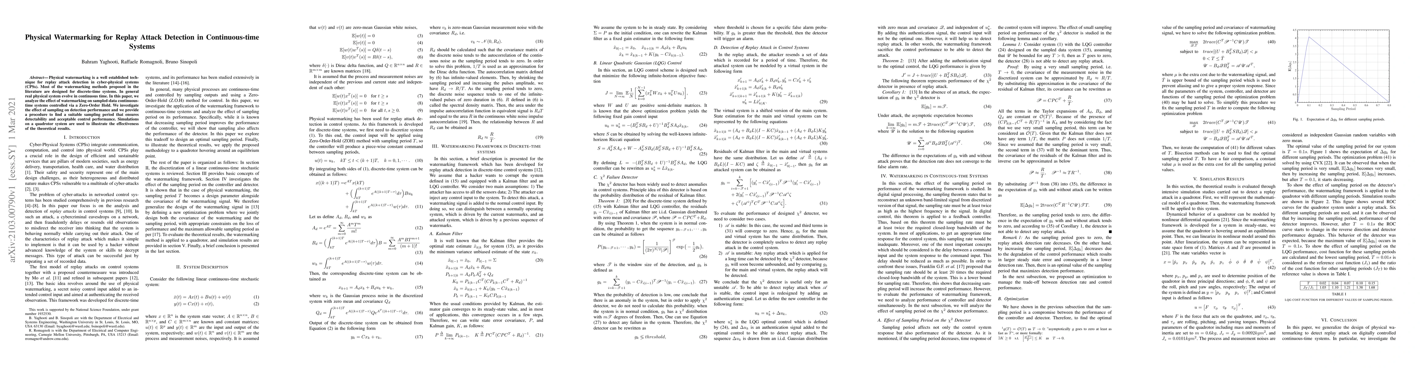 This paper explores the application of physical watermarking for replay attack detection in continuous-time systems, contrasting with existing discrete-time methods. It analyzes the impact of sampling on detection performance and proposes a method to determine an optimal sampling period balancing detectability and control performance, validated through simulations on a quadrotor system.