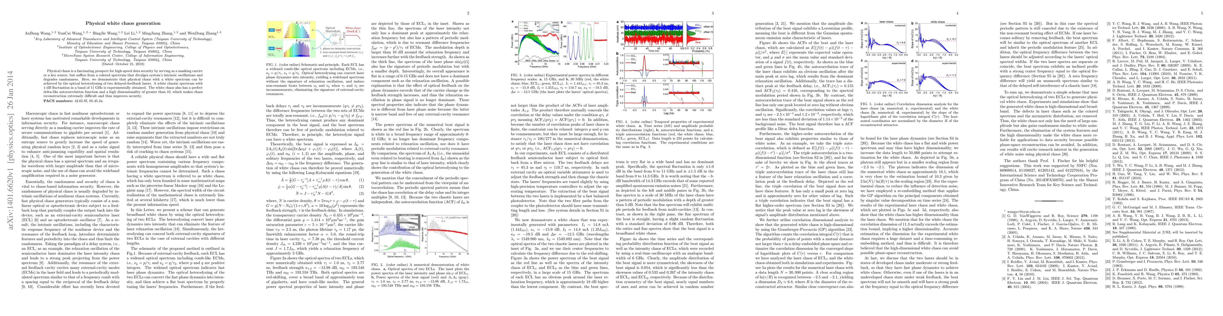 This paper demonstrates the generation of physical chaos with a white spectrum through optical heterodyning of two delayed-feedback lasers, achieving high-speed data security. The resulting white chaotic signal exhibits minimal spectral fluctuations, a perfect delta-like autocorrelation function, and high dimensionality, enhancing security through difficult chaos reconstruction.