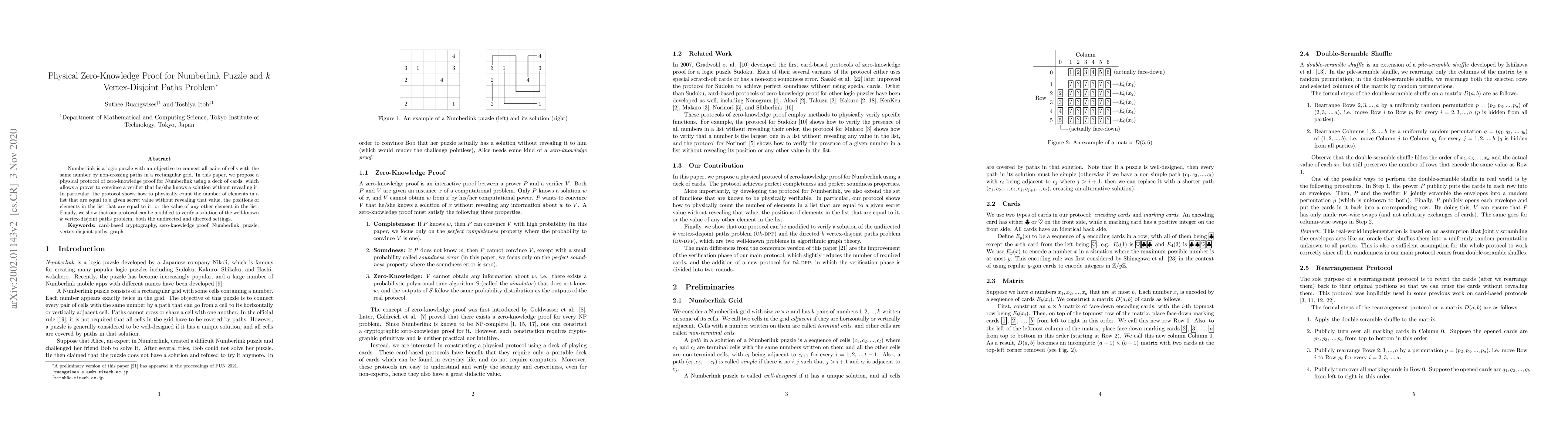 Numberlink is a logic puzzle with an objective to connect all pairs of cells with the same number by non-crossing paths in a rectangular grid. In this paper, we propose a physical protocol of zero-knowledge proof for Numberlink using a deck of cards, which allows a prover to convince a verifier that he/she knows a solution without revealing it. In particular, the protocol shows how to physically count the number of elements in a list that are equal to a given secret value without revealing that value, the positions of elements in the list that are equal to it, or the value of any other element in the list. Finally, we show that our protocol can be modified to verify a solution of the well-known $k$ vertex-disjoint paths problem, both the undirected and directed settings.