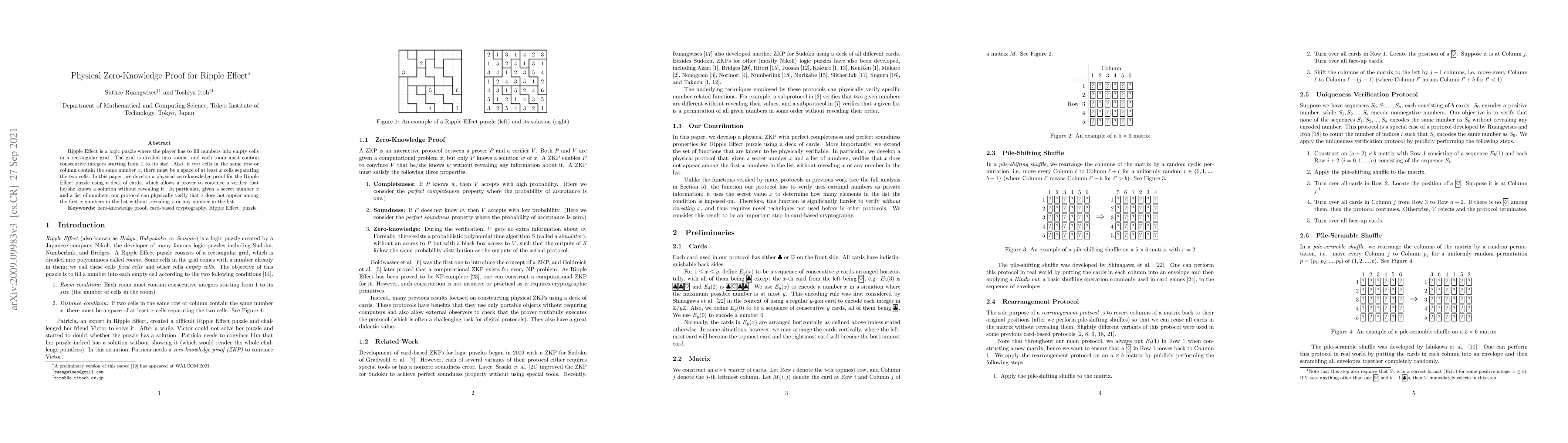 Ripple Effect is a logic puzzle where the player has to fill numbers into empty cells in a rectangular grid. The grid is divided into rooms, and each room must contain consecutive integers starting from 1 to its size. Also, if two cells in the same row or column contain the same number $x$, there must be a space of at least $x$ cells separating the two cells. In this paper, we develop a physical zero-knowledge proof for the Ripple Effect puzzle using a deck of cards, which allows a prover to convince a verifier that he/she knows a solution without revealing it. In particular, given a secret number $x$ and a list of numbers, our protocol can physically verify that $x$ does not appear among the first $x$ numbers in the list without revealing $x$ or any number in the list.