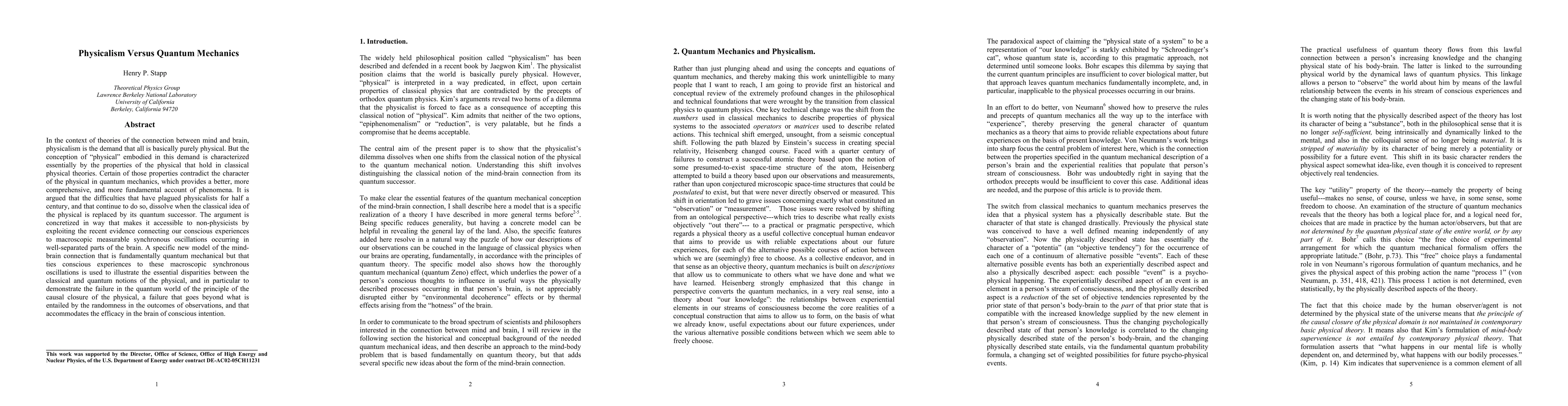 In the context of theories of the connection between mind and brain, physicalism is the demand that all is basically purely physical. But the concept of "physical" embodied in this demand is characterized essentially by the properties of the physical that hold in classical physical theories. Certain of these properties contradict the character of the physical in quantum mechanics, which provides a better, more comprehensive, and more fundamental account of phenomena. It is argued that the difficulties that have plaged physicalists for half a century, and that continue to do so, dissolve when the classical idea of the physical is replaced by its quantum successor. The argument is concretized in a way that makes it accessible to non-physicists by exploiting the recent evidence connecting our conscious experiences to macroscopic measurable synchronous oscillations occurring in well-separated parts of the brain. A specific new model of the mind-brain connection that is fundamentally quantum mechanical but that ties conscious experiences to these macroscopic synchronous oscillations is used to illustrate the essential disparities between the classical and quantum notions of the physical, and in particular to demonstrate the failure in the quantum world of the principle of the causal closure of the physical, a failure that goes beyond what is entailed by the randomness in the outcomes of observations, and that accommodates the efficacy in the brain of conscious intent.