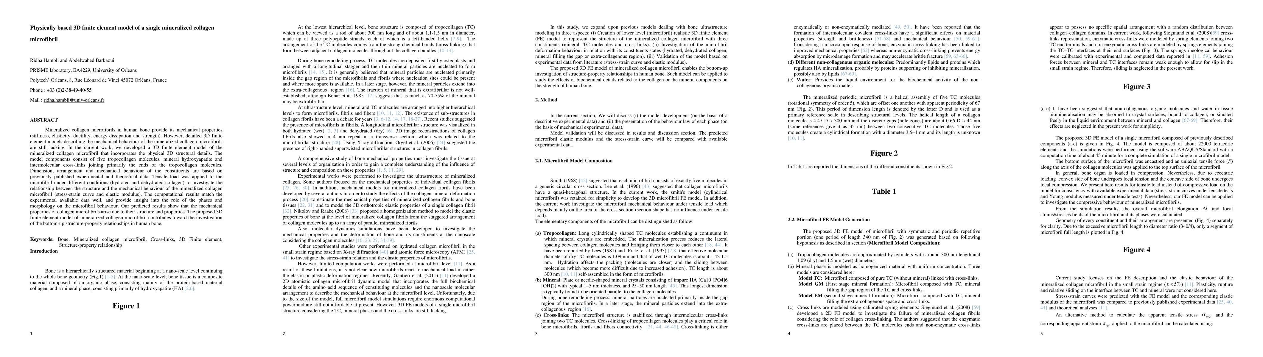 This paper develops a 3D finite element model of a mineralized collagen microfibril, incorporating its physical structure and mechanical behavior. The model's predictions match experimental data, providing insights into how the microfibril's structure influences its mechanical properties.