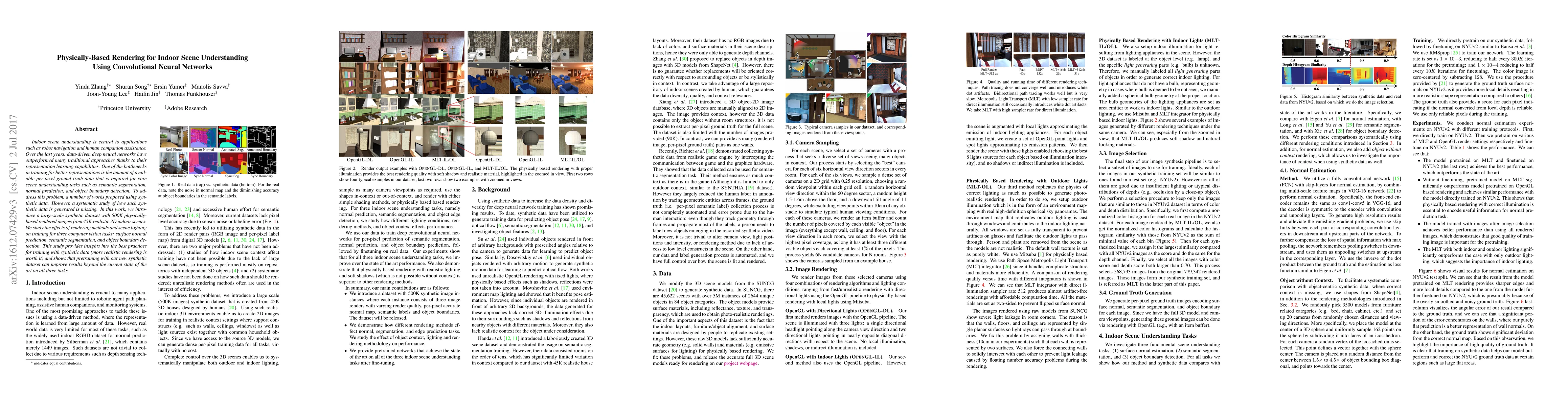 Indoor scene understanding is central to applications such as robot navigation and human companion assistance. Over the last years, data-driven deep neural networks have outperformed many traditional approaches thanks to their representation learning capabilities. One of the bottlenecks in training for better representations is the amount of available per-pixel ground truth data that is required for core scene understanding tasks such as semantic segmentation, normal prediction, and object edge detection. To address this problem, a number of works proposed using synthetic data. However, a systematic study of how such synthetic data is generated is missing. In this work, we introduce a large-scale synthetic dataset with 400K physically-based rendered images from 45K realistic 3D indoor scenes. We study the effects of rendering methods and scene lighting on training for three computer vision tasks: surface normal prediction, semantic segmentation, and object boundary detection. This study provides insights into the best practices for training with synthetic data (more realistic rendering is worth it) and shows that pretraining with our new synthetic dataset can improve results beyond the current state of the art on all three tasks.
