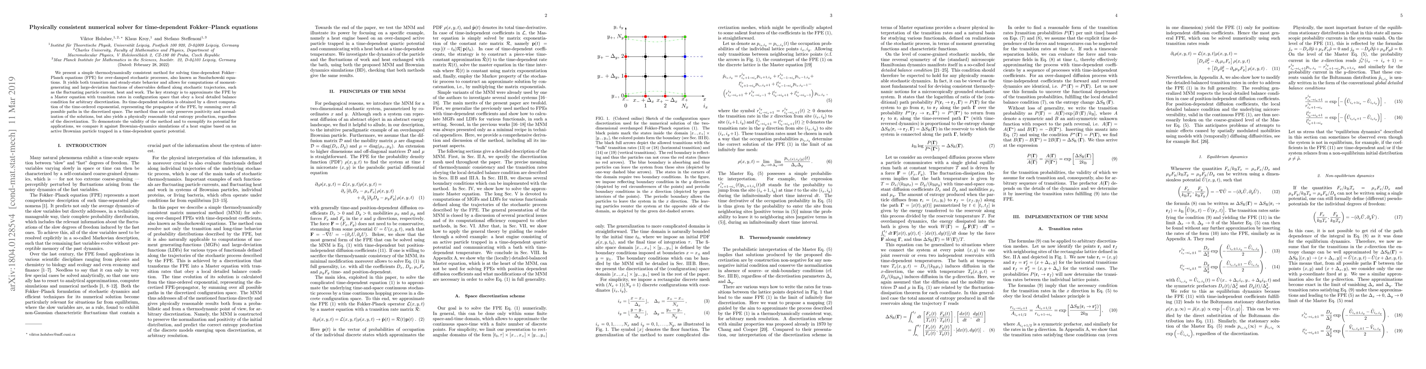 We present a simple thermodynamically consistent method for solving time-dependent Fokker--Planck equations (FPE) for over-damped stochastic processes, also known as Smoluchowski equations. It yields both transition and steady-state behavior and allows for computations of moment-generating and large-deviation functions of observables defined along stochastic trajectories, such as the fluctuating particle current, heat and work. The key strategy is to approximate the FPE by a Master equation with transition rates in configuration space that obey a local detailed balance condition for arbitrary discretization. Its time-dependent solution is obtained by a direct computation of the time-ordered exponential, representing the propagator of the FPE, by summing over all possible paths in the discretized space. The method thus not only preserves positivity and normalization of the solutions, but also yields a physically reasonable total entropy production, regardless of the discretization. To demonstrate the validity of the method and to exemplify its potential for applications, we compare it against Brownian-dynamics simulations of a heat engine based on an active Brownian particle trapped in a time-dependent quartic potential.