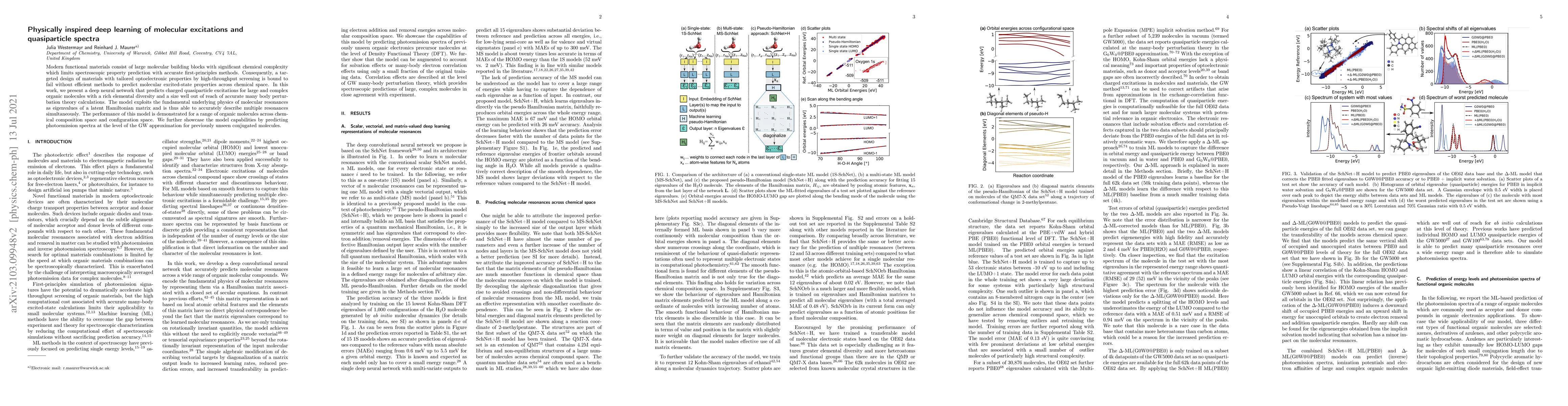 Modern functional materials consist of large molecular building blocks with significant chemical complexity which limits spectroscopic property prediction with accurate first-principles methods. Consequently, a targeted design of materials with tailored optoelectronic properties by high-throughput screening is bound to fail without efficient methods to predict molecular excited-state properties across chemical space. In this work, we present a deep neural network that predicts charged quasiparticle excitations for large and complex organic molecules with a rich elemental diversity and a size well out of reach of accurate many body perturbation theory calculations. The model exploits the fundamental underlying physics of molecular resonances as eigenvalues of a latent Hamiltonian matrix and is thus able to accurately describe multiple resonances simultaneously. The performance of this model is demonstrated for a range of organic molecules across chemical composition space and configuration space. We further showcase the model capabilities by predicting photoemission spectra at the level of the GW approximation for previously unseen conjugated molecules.