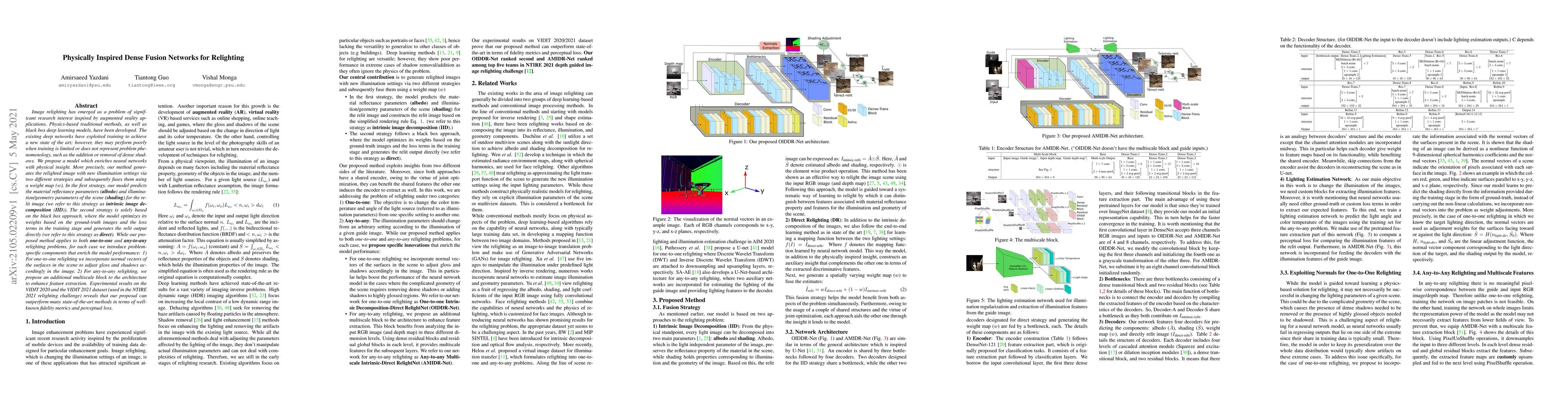 Image relighting has emerged as a problem of significant research interest inspired by augmented reality applications. Physics-based traditional methods, as well as black box deep learning models, have been developed. The existing deep networks have exploited training to achieve a new state of the art; however, they may perform poorly when training is limited or does not represent problem phenomenology, such as the addition or removal of dense shadows. We propose a model which enriches neural networks with physical insight. More precisely, our method generates the relighted image with new illumination settings via two different strategies and subsequently fuses them using a weight map (w). In the first strategy, our model predicts the material reflectance parameters (albedo) and illumination/geometry parameters of the scene (shading) for the relit image (we refer to this strategy as intrinsic image decomposition (IID)). The second strategy is solely based on the black box approach, where the model optimizes its weights based on the ground-truth images and the loss terms in the training stage and generates the relit output directly (we refer to this strategy as direct). While our proposed method applies to both one-to-one and any-to-any relighting problems, for each case we introduce problem-specific components that enrich the model performance: 1) For one-to-one relighting we incorporate normal vectors of the surfaces in the scene to adjust gloss and shadows accordingly in the image. 2) For any-to-any relighting, we propose an additional multiscale block to the architecture to enhance feature extraction. Experimental results on the VIDIT 2020 and the VIDIT 2021 dataset (used in the NTIRE 2021 relighting challenge) reveals that our proposal can outperform many state-of-the-art methods in terms of well-known fidelity metrics and perceptual loss.