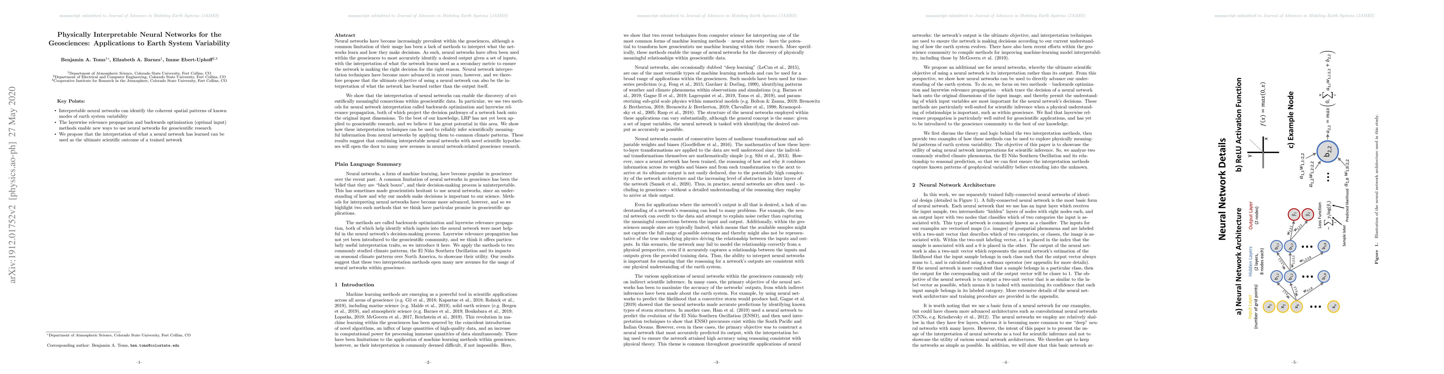 Neural networks have become increasingly prevalent within the geosciences, although a common limitation of their usage has been a lack of methods to interpret what the networks learn and how they make decisions. As such, neural networks have often been used within the geosciences to most accurately identify a desired output given a set of inputs, with the interpretation of what the network learns used as a secondary metric to ensure the network is making the right decision for the right reason. Neural network interpretation techniques have become more advanced in recent years, however, and we therefore propose that the ultimate objective of using a neural network can also be the interpretation of what the network has learned rather than the output itself. We show that the interpretation of neural networks can enable the discovery of scientifically meaningful connections within geoscientific data. In particular, we use two methods for neural network interpretation called backwards optimization and layerwise relevance propagation, both of which project the decision pathways of a network back onto the original input dimensions. To the best of our knowledge, LRP has not yet been applied to geoscientific research, and we believe it has great potential in this area. We show how these interpretation techniques can be used to reliably infer scientifically meaningful information from neural networks by applying them to common climate patterns. These results suggest that combining interpretable neural networks with novel scientific hypotheses will open the door to many new avenues in neural network-related geoscience research.