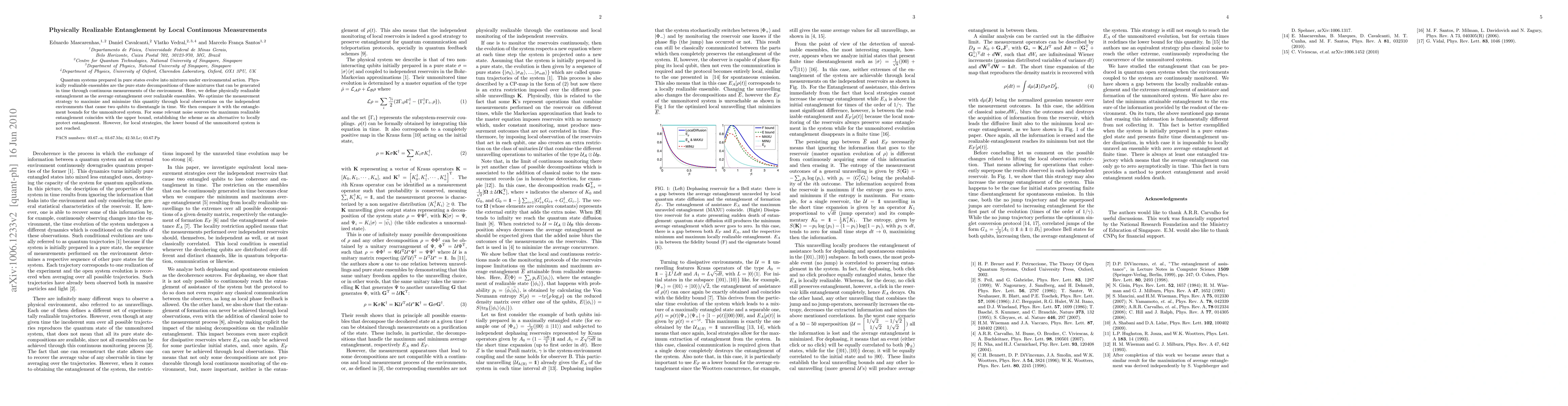 This paper defines physically realizable entanglement as the average entanglement over ensembles that can be generated through continuous local measurements of the environment. It optimizes measurement strategies to maximize and minimize this quantity, showing that for certain noise sources, the maximum realizable entanglement matches the upper bound, suggesting a potential method for locally protecting entanglement.