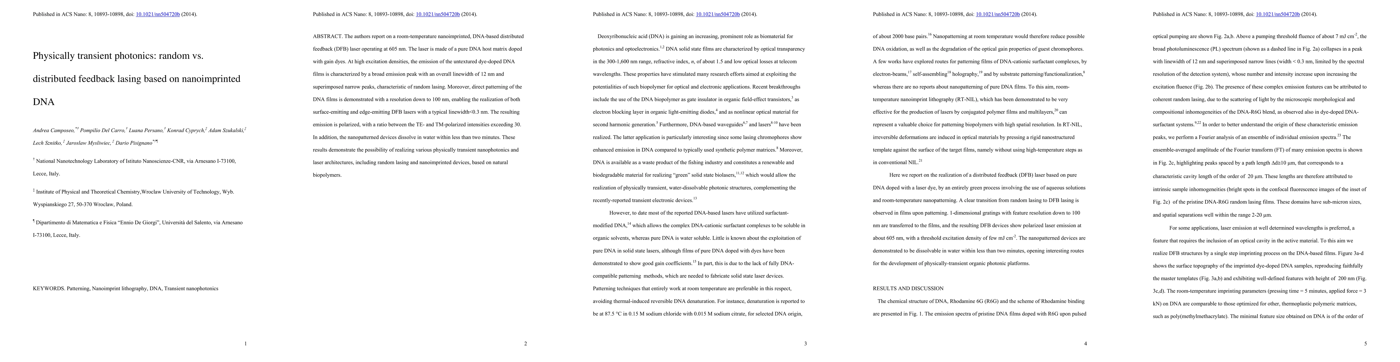 This paper explores the development of a room-temperature DNA-based distributed feedback laser operating at 605 nm, demonstrating both random and DFB lasing modes. The nanoimprinted DNA films exhibit polarized emission with high resolution and dissolve in water, showcasing the potential for transient nanophotonic devices.
