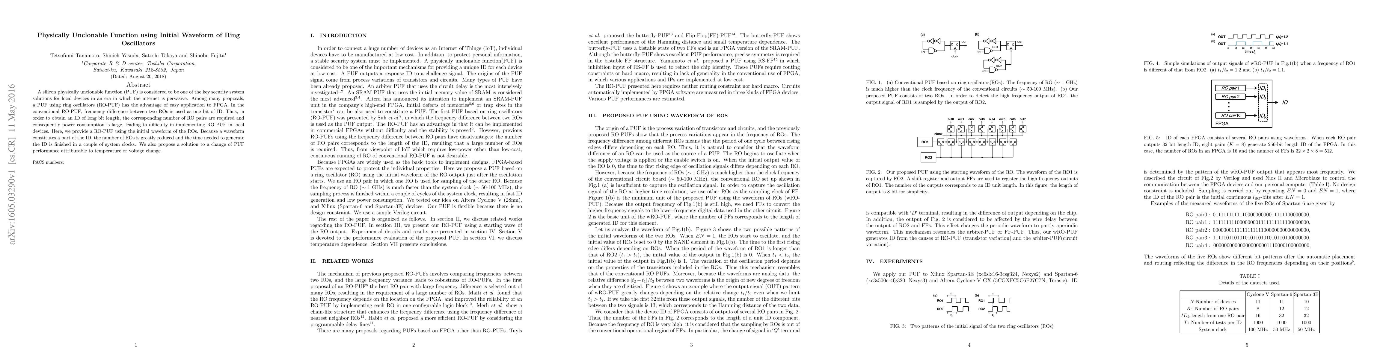 A silicon physically unclonable function (PUF) is considered to be one of the key security system solutions for local devices in an era in which the internet is pervasive. Among many proposals, a PUF using ring oscillators (RO-PUF) has the advantage of easy application to FPGA. In the conventional RO-PUF, frequency difference between two ROs is used as one bit of ID. Thus, in order to obtain an ID of long bit length, the corresponding number of RO pairs are required and consequently power consumption is large, leading to difficulty in implementing RO-PUF in local devices. Here, we provide a RO-PUF using the initial waveform of the ROs. Because a waveform constitutes a part of the ID, the number of ROs is greatly reduced and the time needed to generate the ID is finished in a couple of system clocks. We also propose a solution to a change of PUF performance attributable to temperature or voltage change.