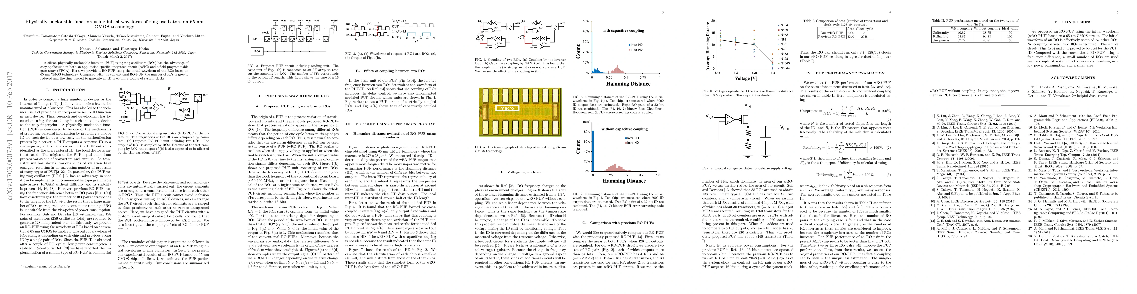 A silicon physically unclonable function (PUF) using ring oscillators (ROs) has the advantage of easy application in both an application specific integrated circuit (ASIC) and a field-programmable gate array (FPGA). Here, we provide a RO-PUF using the initial waveform of the ROs based on 65 nm CMOS technology. Compared with the conventional RO-PUF, the number of ROs is greatly reduced and the time needed to generate an ID is within a couple of system clocks.