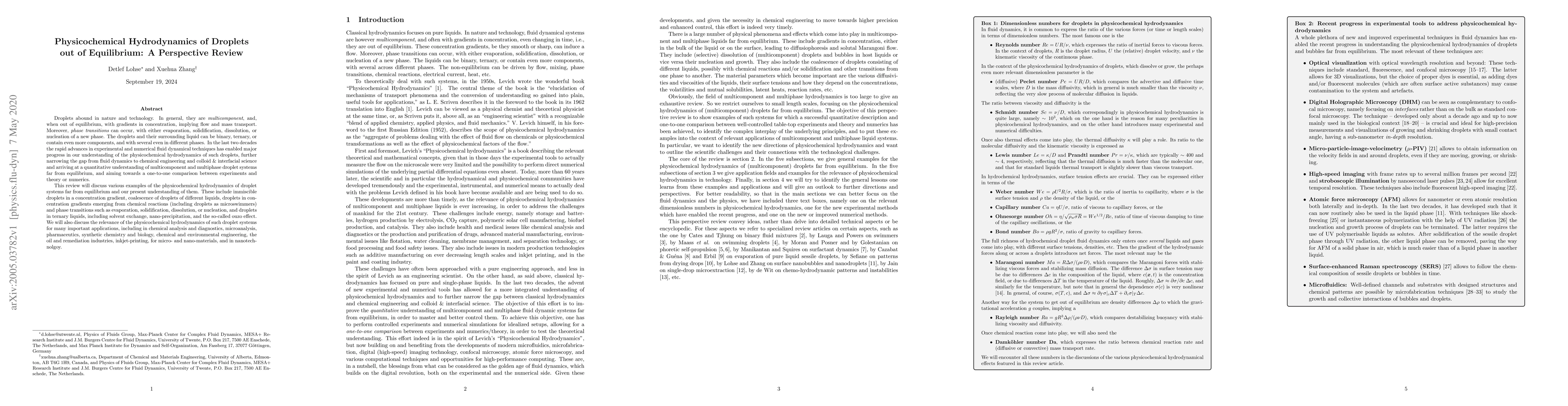 This review explores the physicochemical hydrodynamics of out-of-equilibrium droplets, highlighting recent advances in understanding multicomponent, multiphase systems. It discusses various phenomena like droplet coalescence, phase transitions, and applications in diverse fields, aiming for a quantitative link between theory, experiments, and numerics.