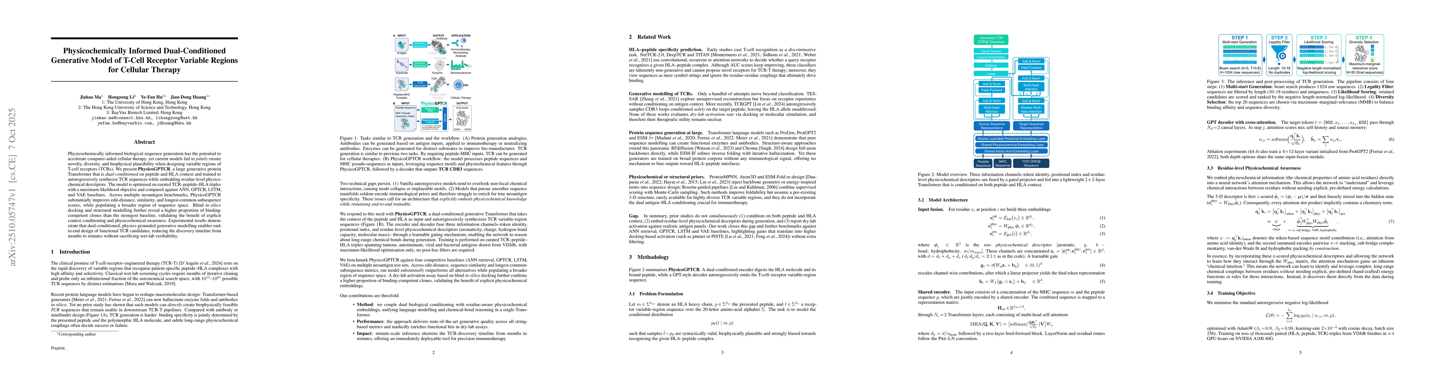 Physicochemically informed biological sequence generation has the potential to accelerate computer-aided cellular therapy, yet current models fail to \emph{jointly} ensure novelty, diversity, and biophysical plausibility when designing variable regions of T-cell receptors (TCRs). We present \textbf{PhysicoGPTCR}, a large generative protein Transformer that is \emph{dual-conditioned} on peptide and HLA context and trained to autoregressively synthesise TCR sequences while embedding residue-level physicochemical descriptors. The model is optimised on curated TCR--peptide--HLA triples with a maximum-likelihood objective and compared against ANN, GPTCR, LSTM, and VAE baselines. Across multiple neoantigen benchmarks, PhysicoGPTCR substantially improves edit-distance, similarity, and longest-common-subsequence scores, while populating a broader region of sequence space. Blind in-silico docking and structural modelling further reveal a higher proportion of binding-competent clones than the strongest baseline, validating the benefit of explicit context conditioning and physicochemical awareness. Experimental results demonstrate that dual-conditioned, physics-grounded generative modelling enables end-to-end design of functional TCR candidates, reducing the discovery timeline from months to minutes without sacrificing wet-lab verifiability.