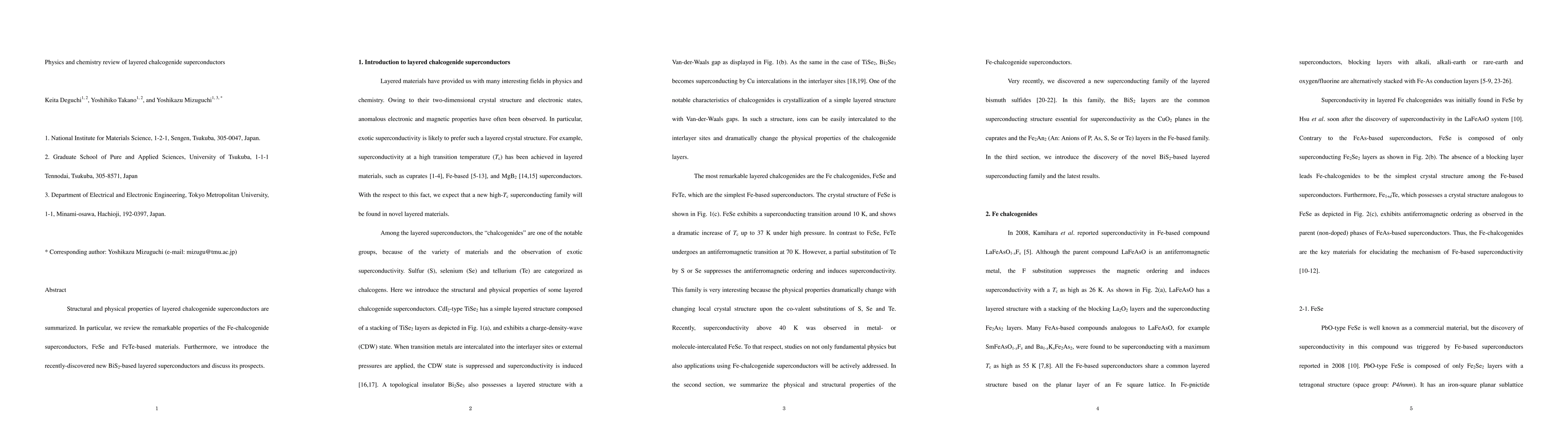 Structural and physical properties of layered chalcogenide superconductors are summarized. In particular, we review the remarkable properties of the Fe-chalcogenide superconductors, FeSe and FeTe-based materials. Furthermore, we introduce the recently-discovered new BiS2-based layered superconductors and discuss its prospects.