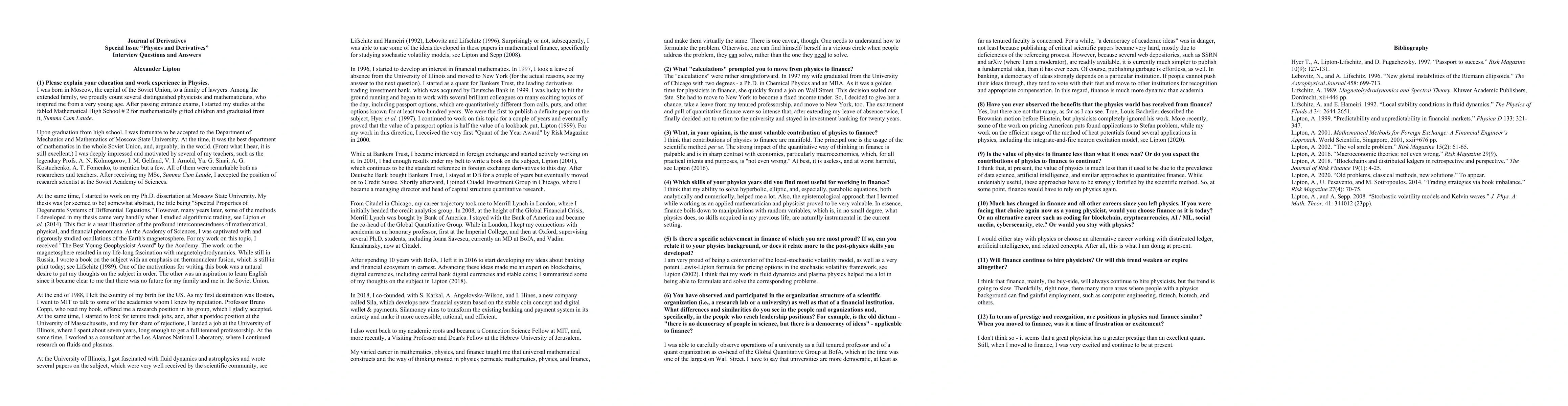 Answers to interview questions sent to a selected group of former physicists working in finance. The interview will be published as part of a Special Issue on Physics and Derivatives by The Journal of Derivatives in the second half of 2020.