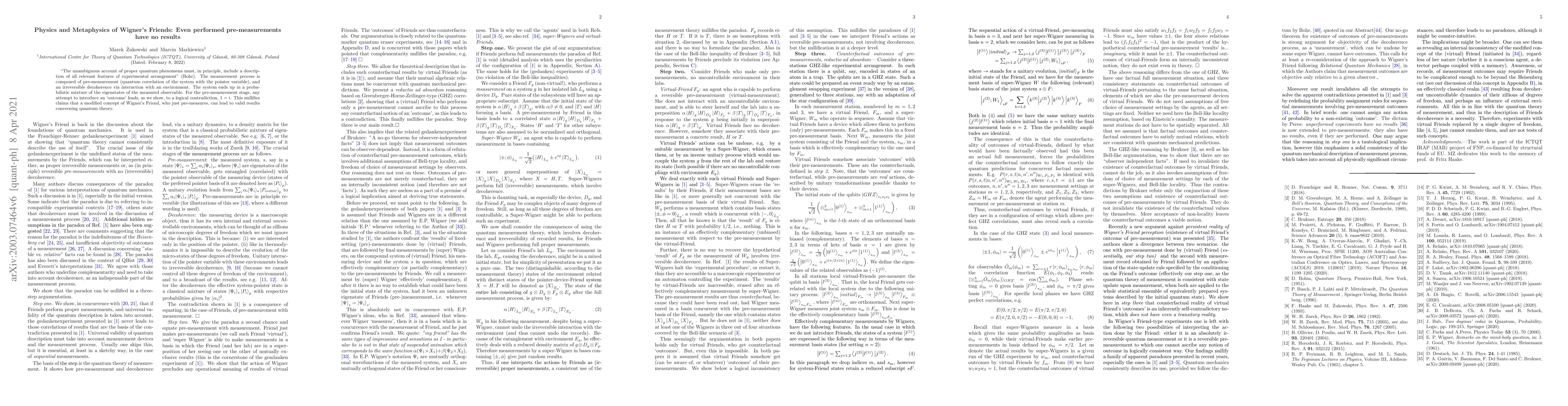 "The unambiguous account of proper quantum phenomena must, in principle, include a description of all relevant features of experimental arrangement" (Bohr). The measurement process is composed of pre-measurement (quantum correlation of the system with the pointer variable), and an irreversible decoherence via interaction with an environment. The system ends up in a probabilistic mixture of the eigenstates of the measured observable. For the pre-measurement stage, any attempt to introduce an 'outcome' leads, as we show, to a logical contradiction, $1=i$. This nullifies claims that a modified concept of Wigner's Friend, who just pre-measures, can lead to valid results concerning quantum theory.