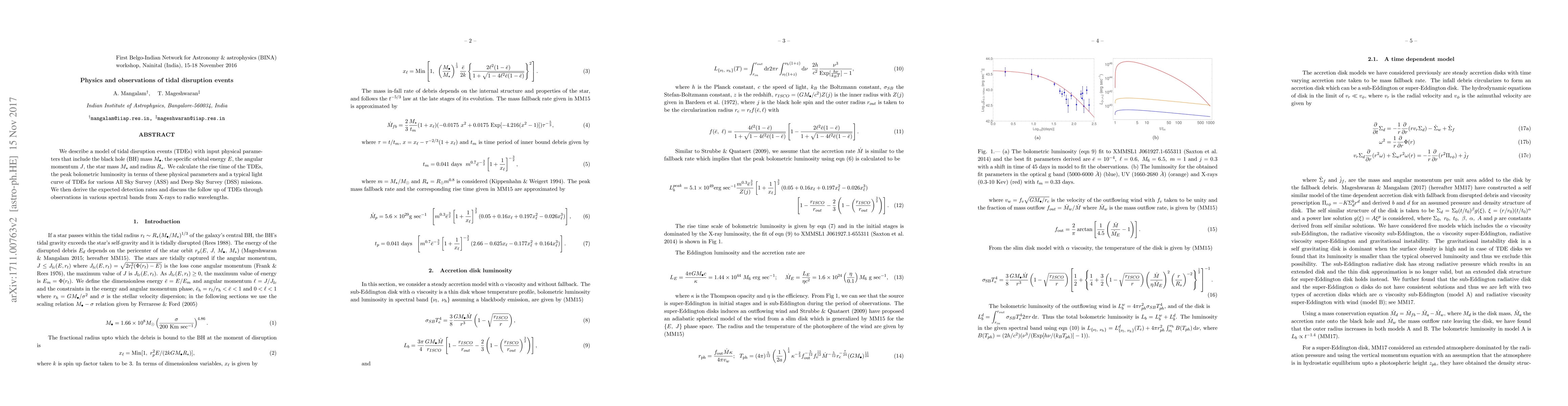 We describe a model of tidal disruption events (TDEs) with input physical parameters that include the black hole (BH) mass $M_{\bullet}$, the specific orbital energy $E$, the angular momentum $J$, the star mass $M_{\star}$ and radius $R_{\star}$. We calculate the rise time of the TDEs, the peak bolometric luminosity in terms of these physical parameters and a typical light curve of TDEs for various All Sky Survey (ASS) and Deep Sky Survey (DSS) missions. We then derive the expected detection rates and discuss the follow up of TDEs through observations in various spectral bands from X-rays to radio wavelengths.