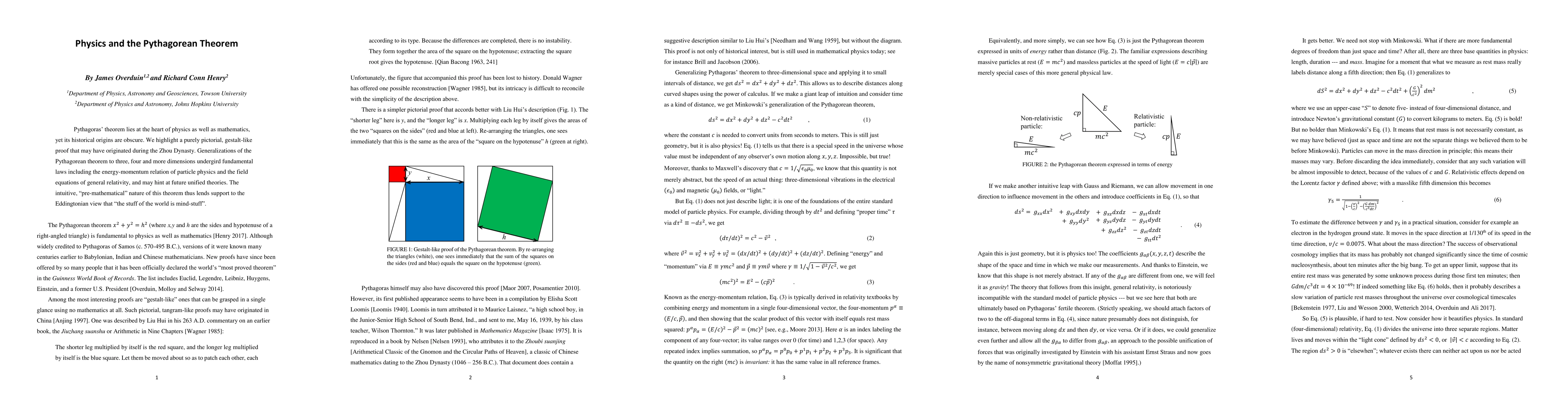 Pythagoras' theorem lies at the heart of physics as well as mathematics, yet its historical origins are obscure. We highlight a purely pictorial, gestalt-like proof that may have originated during the Zhou Dynasty. Generalizations of the Pythagorean theorem to three, four and more dimensions undergird fundamental laws including the energy-momentum relation of particle physics and the field equations of general relativity, and may hint at future unified theories. The "pre-mathematical" nature of this theorem lends support to the Eddingtonian view that "the stuff of the world is mind-stuff."
