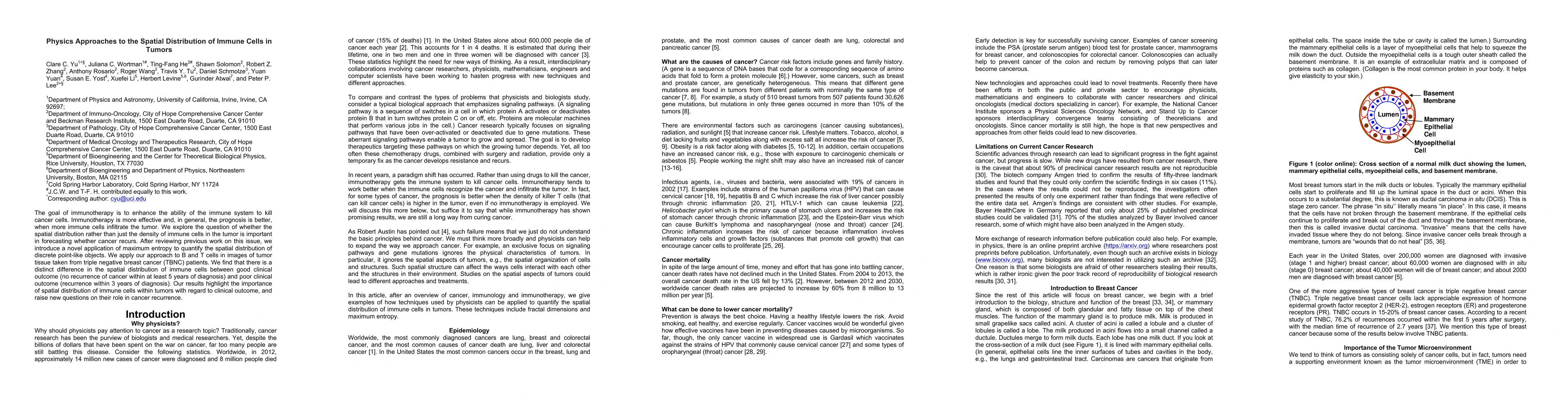 The goal of immunotherapy is to enhance the ability of the immune system to kill cancer cells. Immunotherapy is more effective and, in general, the prognosis is better, when more immune cells infiltrate the tumor. We explore the question of whether the spatial distribution rather than just the density of immune cells in the tumor is important in forecasting whether cancer recurs. After reviewing previous work on this issue, we introduce a novel application of maximum entropy to quantify the spatial distribution of discrete point-like objects. We apply our approach to B and T cells in images of tumor tissue taken from triple negative breast cancer (TBNC) patients. We find that there is a distinct difference in the spatial distribution of immune cells between good clinical outcome (no recurrence of cancer within at least 5 years of diagnosis) and poor clinical outcome (recurrence within 3 years of diagnosis). Our results highlight the importance of spatial distribution of immune cells within tumors with regard to clinical outcome, and raise new questions on their role in cancer recurrence.