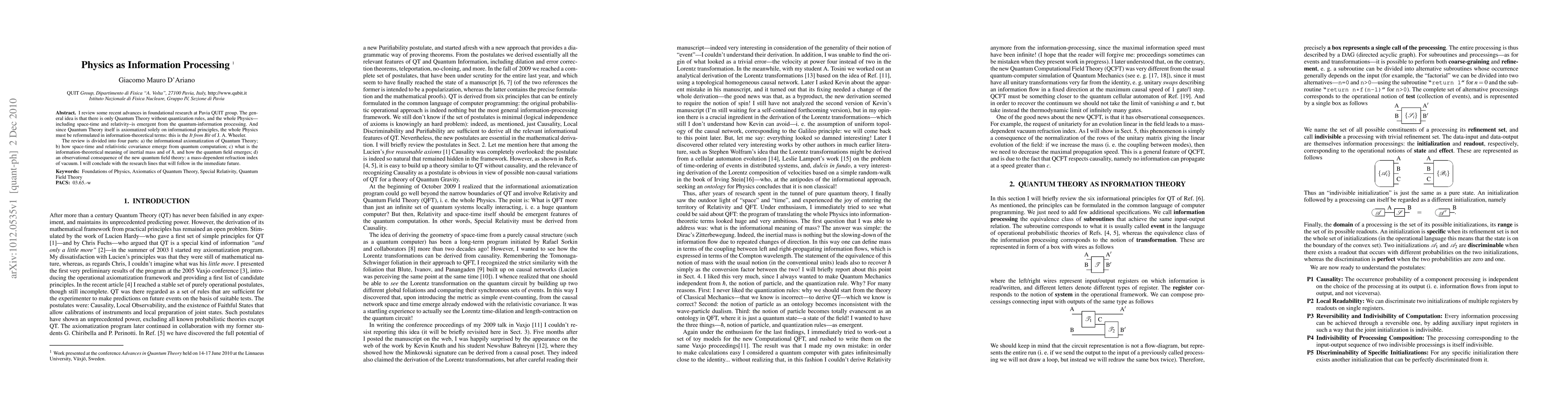 I review some recent advances in foundational research at Pavia QUIT group. The general idea is that there is only Quantum Theory without quantization rules, and the whole Physics---including space-time and relativity--is emergent from the quantum-information processing. And since Quantum Theory itself is axiomatized solely on informational principles, the whole Physics must be reformulated in information-theoretical terms: this is the "It from Bit of J. A. Wheeler. The review is divided into four parts: a) the informational axiomatization of Quantum Theory; b) how space-time and relativistic covariance emerge from quantum computation; c) what is the information-theoretical meaning of inertial mass and of $\hbar$, and how the quantum field emerges; d) an observational consequence of the new quantum field theory: a mass-dependent refraction index of vacuum. I will conclude with the research lines that will follow in the immediate future.