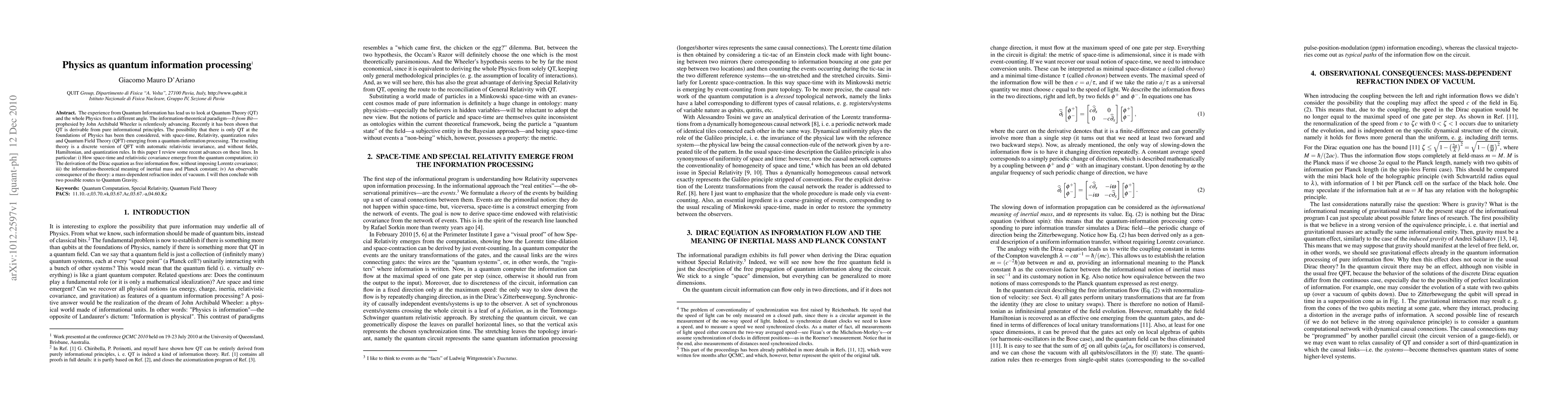 The experience from Quantum Information has lead us to look at Quantum Theory (QT) and the whole Physics from a different angle. The information-theoretical paradigm---"It from Bit'---prophesied by John Archibald Wheeler is relentlessly advancing. Recently it has been shown that QT is derivable from pure informational principles. The possibility that there is only QT at the foundations of Physics has been then considered, with space-time, Relativity, quantization rules and Quantum Field Theory (QFT) emerging from a quantum-information processing. The resulting theory is a discrete version of QFT with automatic relativistic invariance, and without fields, Hamiltonian, and quantization rules. In this paper I review some recent advances on these lines. In particular: i) How space-time and relativistic covariance emerge from the quantum computation; ii) The derivation of the Dirac equation as free information flow, without imposing Lorentz covariance; iii) the information-theoretical meaning of inertial mass and Planck constant; iv) An observable consequence of the theory: a mass-dependent refraction index of vacuum. I will then conclude with two possible routes to Quantum Gravity.