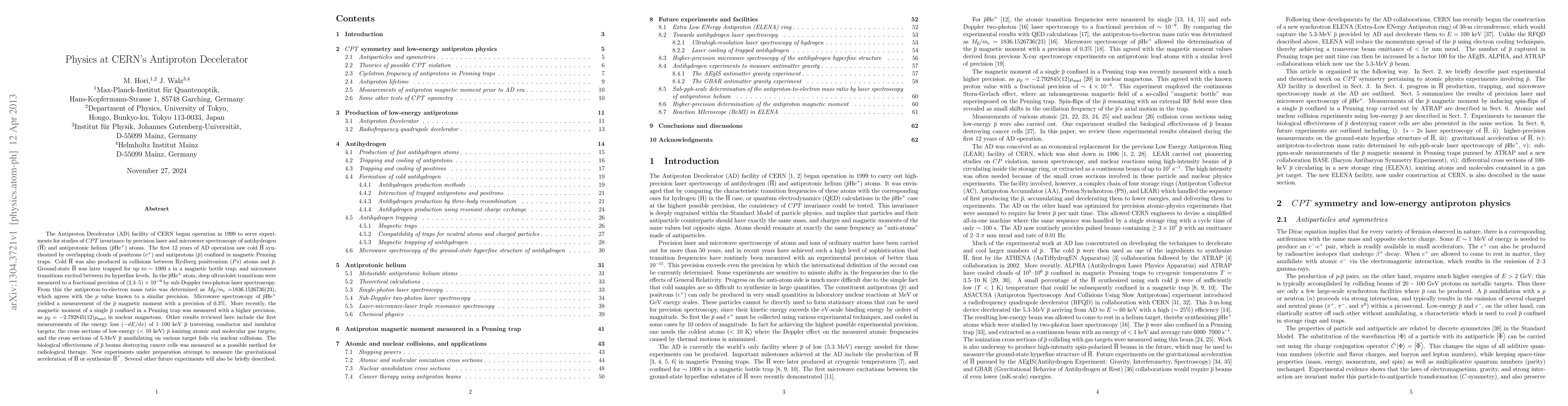 The Antiproton Decelerator of CERN began operation in 1999 to serve experiments for studies of CPT invariance by precision laser and microwave spectroscopy of antihydrogen ($\bar{\rm H}$) and antiprotonic helium ($\bar{p}{\rm He}^+$). The first 12 years of operation saw cold $\bar{\rm H}$ synthesized by overlapping clouds of positrons ($e^+$) and antiprotons ($\bar{p}$) confined in magnetic Penning traps. Cold $\bar{\rm H}$ was also produced in collisions between Rydberg positronium atoms and $\bar{p}$. Ground-state $\bar{\rm H}$ was later trapped for up to $\sim 1000$ s in a magnetic bottle trap, and microwave transitions excited between its hyperfine levels. In the $\bar{p}{\rm He}^+$ atom, UV transitions were measured to a precision of (2.3-5) $\times$ $10^{-9}$ by sub-Doppler two-photon laser spectroscopy. From this the antiproton-to-electron mass ratio was determined as $M_{\bar{p}}/m_e=$1836.1526736(23), which agrees with the p value. Microwave spectroscopy of $\bar{p}{\rm He}^+$ yielded a measurement of the $\bar{p}$ magnetic moment with a precision of 0.3%. More recently the magnetic moment of a single $\bar{p}$ confined in a Penning trap was measured with a higher precision, as $\mu_{\bar{p}}=-2.792845(12)$$\mu_{\rm nucl}$ in nuclear magnetons. Other measurements include the energy loss of 1-100 keV $\bar{p}$ traversing conductor and insulator targets; the cross sections of <10 keV $\bar{p}$ ionizing gas targets; and the cross sections of 5-MeV $\bar{p}$ annihilating on target foils via nuclear collisions. The biological effectiveness of $\bar{p}$ beams destroying cancer cells was measured as a possible method for radiological therapy. New experiments under preparation attempt to measure the gravitational acceleration of $\bar{\rm H}$ or synthesize $\obar{\rm H}^+$.