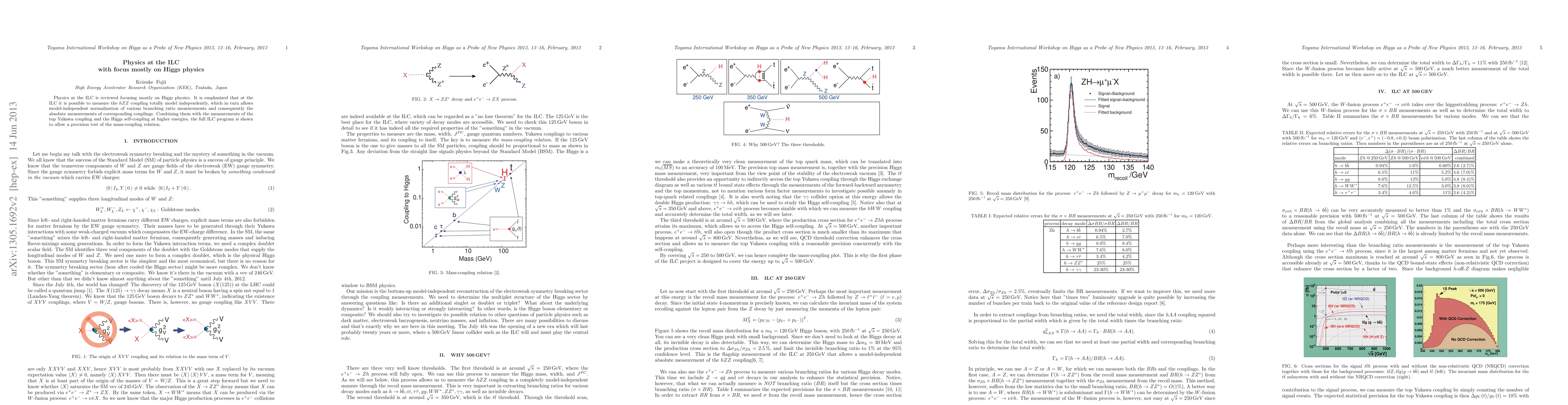 This paper reviews physics at the International Linear Collider (ILC), emphasizing Higgs physics. It highlights the ILC's capability to measure the $hZZ$ coupling model independently, enabling precise normalization of branching ratios and coupling measurements, and facilitating a comprehensive test of the mass-coupling relation.