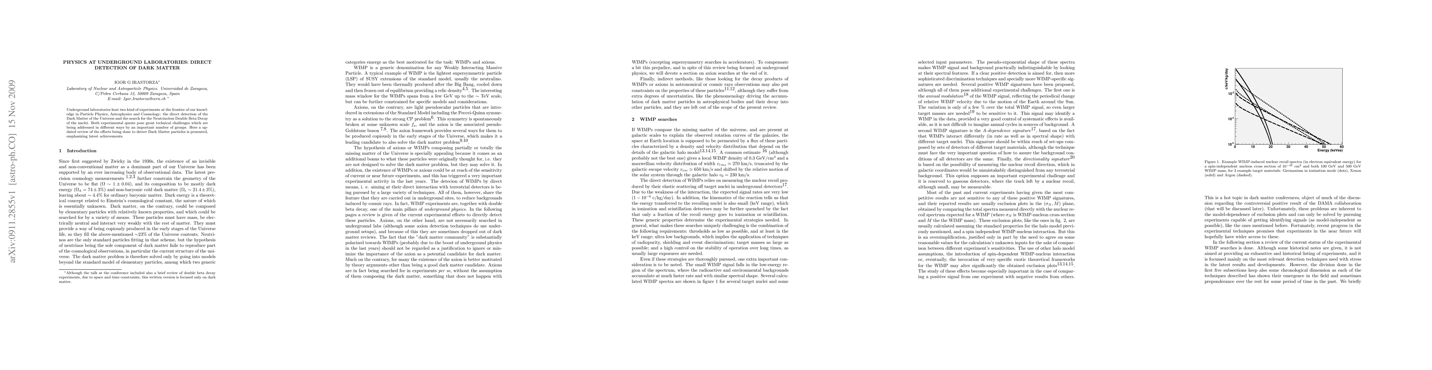Underground laboratories host two kind of experiments at the frontier of our knowledge in Particle Physics, Astrophysics and Cosmology: the direct detection of the Dark Matter of the Universe and the search for the Neutrinoless Double Beta Decay of the nuclei. Both experimental quests pose great technical challenges which are being addressed in different ways by an important number of groups. Here a updated review of the efforts being done to detect Dark Matter particles is presented, emphasizing latest achievements.