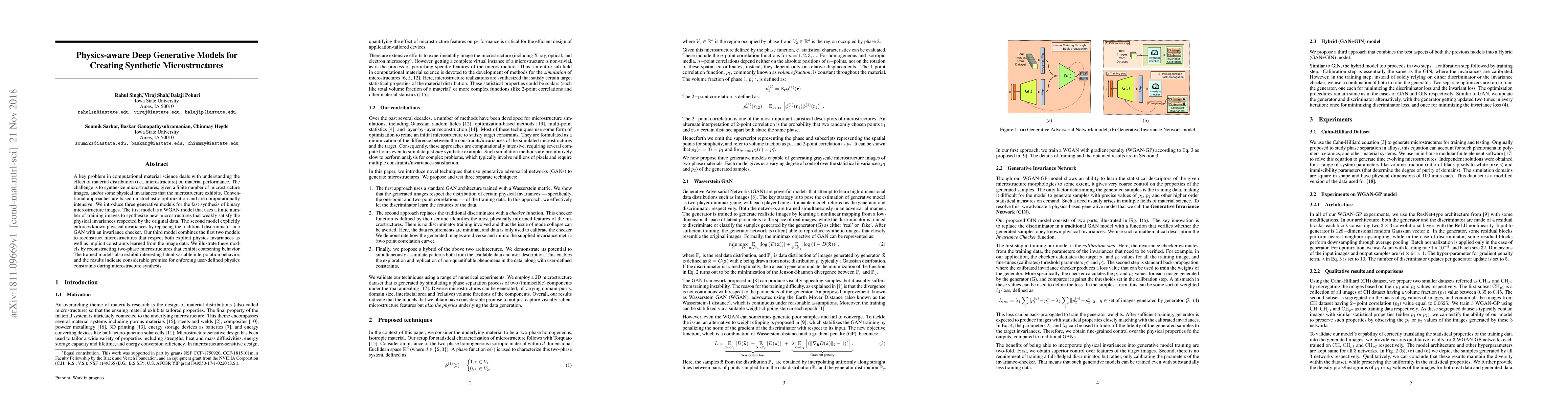 A key problem in computational material science deals with understanding the effect of material distribution (i.e., microstructure) on material performance. The challenge is to synthesize microstructures, given a finite number of microstructure images, and/or some physical invariances that the microstructure exhibits. Conventional approaches are based on stochastic optimization and are computationally intensive. We introduce three generative models for the fast synthesis of binary microstructure images. The first model is a WGAN model that uses a finite number of training images to synthesize new microstructures that weakly satisfy the physical invariances respected by the original data. The second model explicitly enforces known physical invariances by replacing the traditional discriminator in a GAN with an invariance checker. Our third model combines the first two models to reconstruct microstructures that respect both explicit physics invariances as well as implicit constraints learned from the image data. We illustrate these models by reconstructing two-phase microstructures that exhibit coarsening behavior. The trained models also exhibit interesting latent variable interpolation behavior, and the results indicate considerable promise for enforcing user-defined physics constraints during microstructure synthesis.