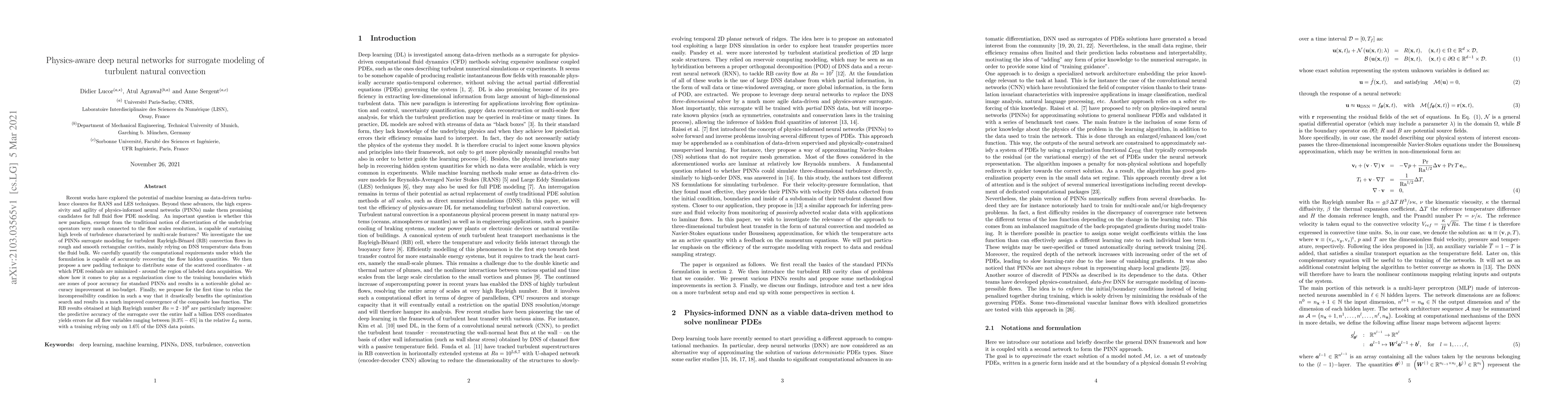 This research explores the use of Physics-aware deep neural networks (PINNs) for modeling turbulent Rayleigh-Bénard convection flows in rough and smooth rectangular cavities. The study demonstrates that PINNs can accurately recover flow hidden quantities from DNS temperature data, even at high Rayleigh numbers. A new padding technique is proposed to improve accuracy around training boundaries, and the incompressibility condition is relaxed to enhance optimization and convergence. The results show that PINNs can predict flow variables with errors between 0.3% -- 4% in the relative L 2 norm, trained on only 1.6% of the DNS data points.