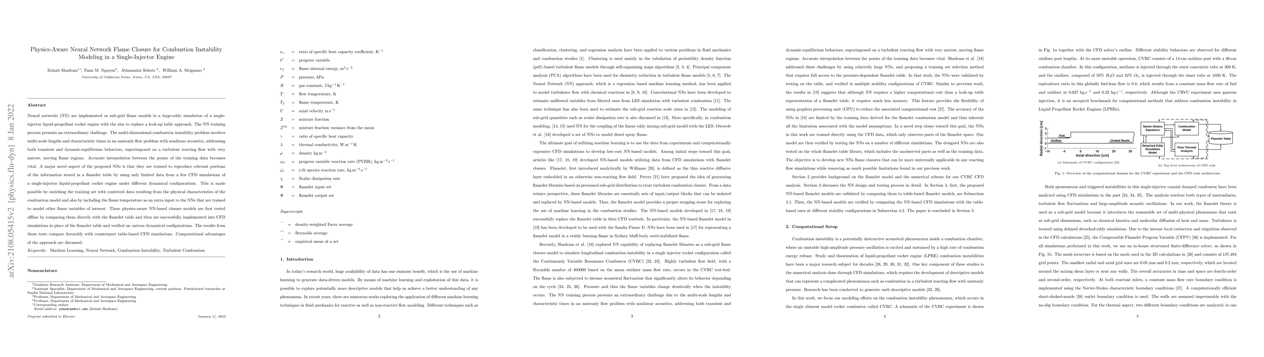 Neural networks (NN) are implemented as sub-grid flame models in a large-eddy simulation of a single-injector liquid-propellant rocket engine with the aim to replace a look-up table approach. The NN training process presents an extraordinary challenge. The multi-dimensional combustion instability problem involves multi-scale lengths and characteristic times in an unsteady flow problem with nonlinear acoustics, addressing both transient and dynamic-equilibrium behaviors, superimposed on a turbulent reacting flow with very narrow, moving flame regions. Accurate interpolation between the points of the training data becomes vital. A major novel aspect of the proposed NNs is that they are trained to reproduce relevant portions of the information stored in a flamelet table by using only limited data from a few CFD simulations of a single-injector liquid-propellant rocket engine under different dynamical configurations. This is made possible by enriching the training set with contrived data resulting from the physical characteristics of the combustion model and also by including the flame temperature as an extra input to the NNs that are trained to model other flame variables of interest. These physics-aware NN-based closure models are first tested offline by comparing them directly with the flamelet table and then are successfully implemented into CFD simulations in place of the flamelet table and verified on various dynamical configurations. The results from those tests compare favorably with counterpart table-based CFD simulations. Computational advantages of the approach are discussed.