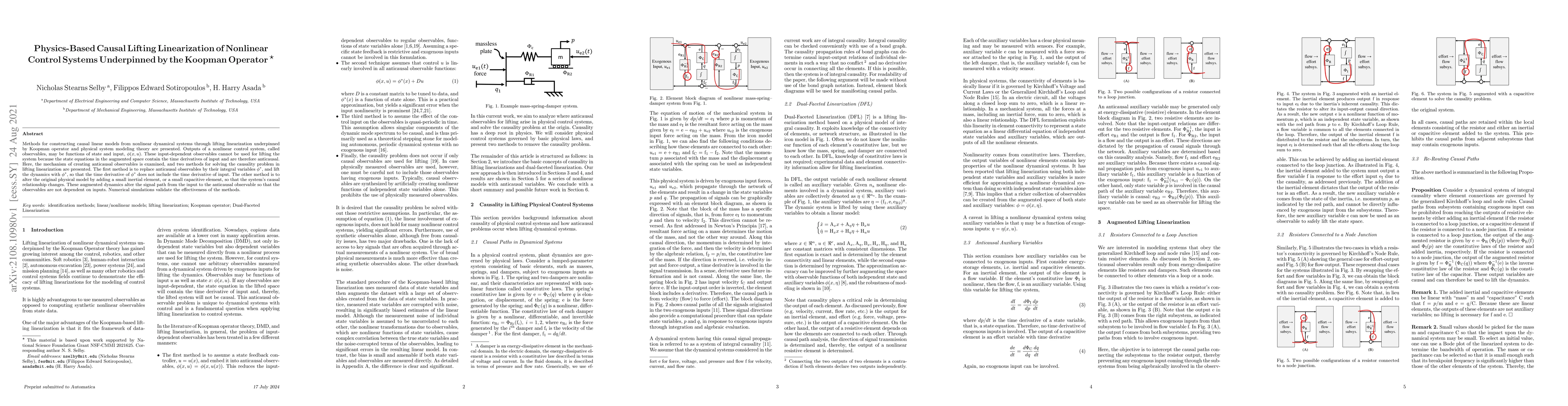 Methods for constructing causal linear models from nonlinear dynamical systems through lifting linearization underpinned by Koopman operator and physical system modeling theory are presented. Outputs of a nonlinear control system, called observables, may be functions of state and input, $\phi(x,u)$. These input-dependent observables cannot be used for lifting the system because the state equations in the augmented space contain the time derivatives of input and are therefore anticausal. Here, the mechanism of creating anticausal observables is examined, and two methods for solving the causality problem in lifting linearization are presented. The first method is to replace anticausal observables by their integral variables $\phi^*$, and lift the dynamics with $\phi^*$, so that the time derivative of $\phi^*$ does not include the time derivative of input. The other method is to alter the original physical model by adding a small inertial element, or a small capacitive element, so that the system's causal relationship changes. These augmented dynamics alter the signal path from the input to the anticausal observable so that the observables are not dependent on inputs. Numerical simulations validate the effectiveness of the methods.