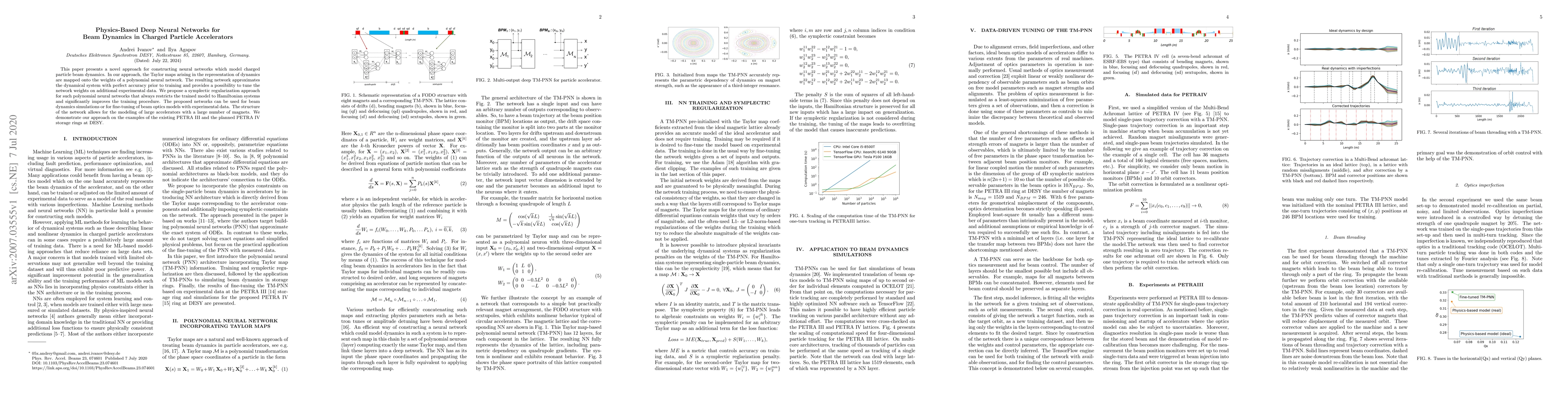 This paper introduces physics-based deep neural networks that accurately model charged particle beam dynamics in accelerators by mapping Taylor maps onto polynomial network weights. A symplectic regularization technique ensures the trained model remains consistent with Hamiltonian systems, enhancing training efficiency and applicability to large accelerators.
