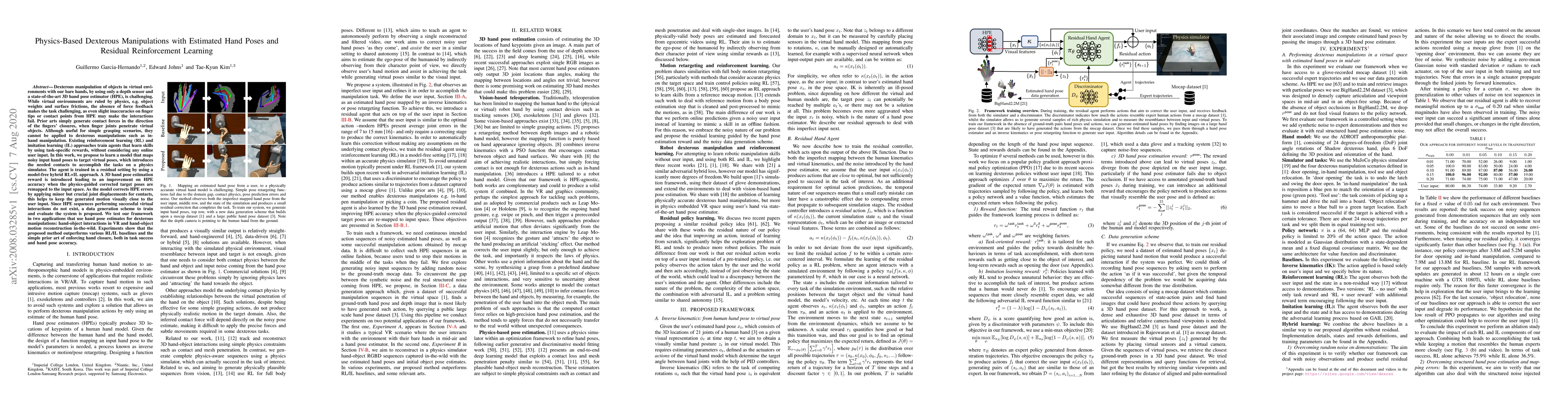 Dexterous manipulation of objects in virtual environments with our bare hands, by using only a depth sensor and a state-of-the-art 3D hand pose estimator (HPE), is challenging. While virtual environments are ruled by physics, e.g. object weights and surface frictions, the absence of force feedback makes the task challenging, as even slight inaccuracies on finger tips or contact points from HPE may make the interactions fail. Prior arts simply generate contact forces in the direction of the fingers' closures, when finger joints penetrate virtual objects. Although useful for simple grasping scenarios, they cannot be applied to dexterous manipulations such as in-hand manipulation. Existing reinforcement learning (RL) and imitation learning (IL) approaches train agents that learn skills by using task-specific rewards, without considering any online user input. In this work, we propose to learn a model that maps noisy input hand poses to target virtual poses, which introduces the needed contacts to accomplish the tasks on a physics simulator. The agent is trained in a residual setting by using a model-free hybrid RL+IL approach. A 3D hand pose estimation reward is introduced leading to an improvement on HPE accuracy when the physics-guided corrected target poses are remapped to the input space. As the model corrects HPE errors by applying minor but crucial joint displacements for contacts, this helps to keep the generated motion visually close to the user input. Since HPE sequences performing successful virtual interactions do not exist, a data generation scheme to train and evaluate the system is proposed. We test our framework in two applications that use hand pose estimates for dexterous manipulations: hand-object interactions in VR and hand-object motion reconstruction in-the-wild.
