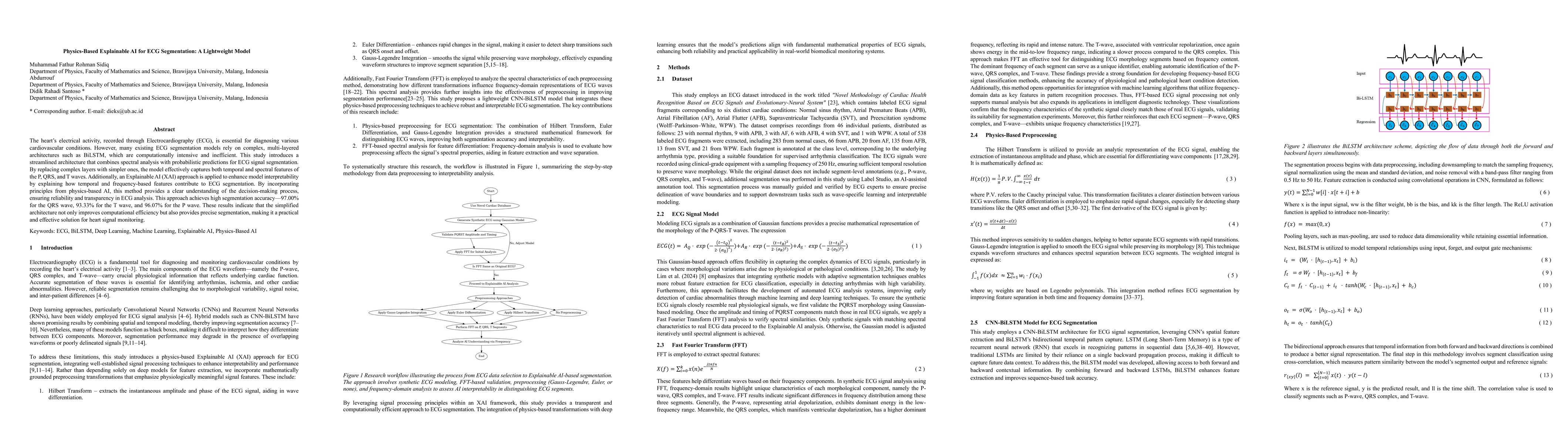 The heart's electrical activity, recorded through Electrocardiography (ECG), is essential for diagnosing various cardiovascular conditions. However, many existing ECG segmentation models rely on complex, multi-layered architectures such as BiLSTM, which are computationally intensive and inefficient. This study introduces a streamlined architecture that combines spectral analysis with probabilistic predictions for ECG signal segmentation. By replacing complex layers with simpler ones, the model effectively captures both temporal and spectral features of the P, QRS, and T waves. Additionally, an Explainable AI (XAI) approach is applied to enhance model interpretability by explaining how temporal and frequency-based features contribute to ECG segmentation. By incorporating principles from physics-based AI, this method provides a clear understanding of the decision-making process, ensuring reliability and transparency in ECG analysis. This approach achieves high segmentation accuracy: 97.00% for the QRS wave, 93.33% for the T wave, and 96.07% for the P wave. These results indicate that the simplified architecture not only improves computational efficiency but also provides precise segmentation, making it a practical and effective solution for heart signal monitoring.