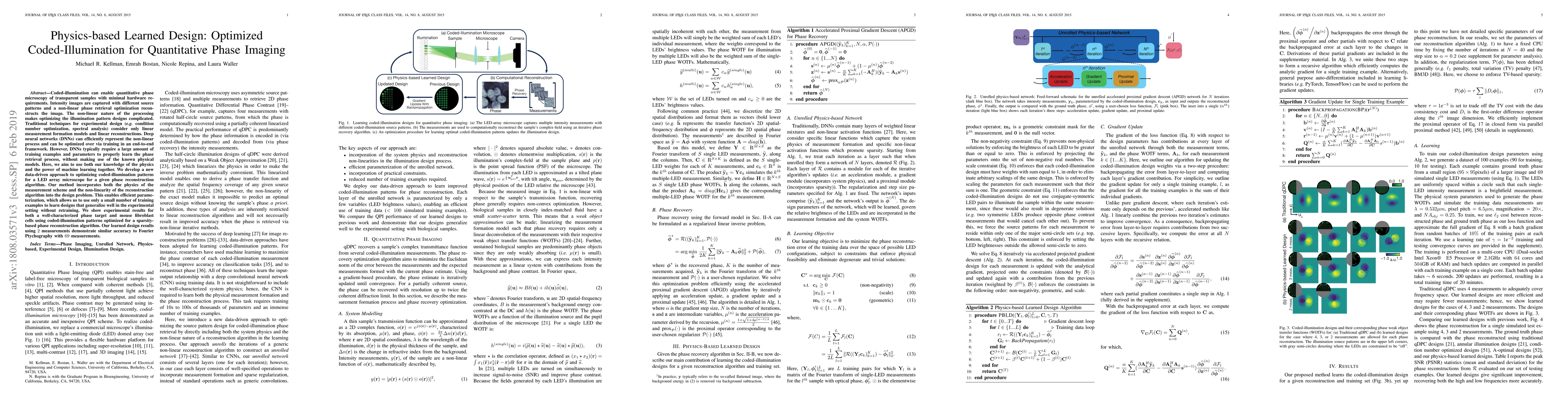 Coded-illumination can enable quantitative phase microscopy of transparent samples with minimal hardware requirements. Intensity images are captured with different source patterns and a non-linear phase retrieval optimization reconstructs the image. The non-linear nature of the processing makes optimizing the illumination pattern designs complicated. Traditional techniques for experimental design (e.g. condition number optimization, spectral analysis) consider only linear measurement formation models and linear reconstructions. Deep neural networks (DNNs) can efficiently represent the non-linear process and can be optimized over via training in an end-to-end framework. However, DNNs typically require a large amount of training examples and parameters to properly learn the phase retrieval process, without making use of the known physical models. Here, we aim to use both our knowledge of the physics and the power of machine learning together. We develop a new data-driven approach to optimizing coded-illumination patterns for a LED array microscope for a given phase reconstruction algorithm. Our method incorporates both the physics of the measurement scheme and the non-linearity of the reconstruction algorithm into the design problem. This enables efficient parameterization, which allows us to use only a small number of training examples to learn designs that generalize well in the experimental setting without retraining. We show experimental results for both a well-characterized phase target and mouse fibroblast cells using coded-illumination patterns optimized for a sparsity-based phase reconstruction algorithm. Our learned design results using 2 measurements demonstrate similar accuracy to Fourier Ptychography with 69 measurements.