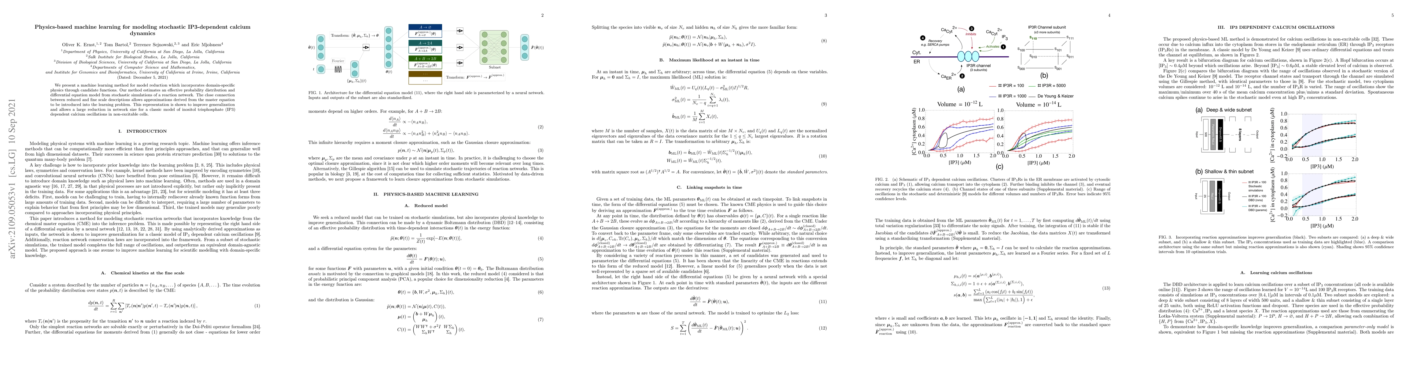 We present a machine learning method for model reduction which incorporates domain-specific physics through candidate functions. Our method estimates an effective probability distribution and differential equation model from stochastic simulations of a reaction network. The close connection between reduced and fine scale descriptions allows approximations derived from the master equation to be introduced into the learning problem. This representation is shown to improve generalization and allows a large reduction in network size for a classic model of inositol trisphosphate (IP3) dependent calcium oscillations in non-excitable cells.