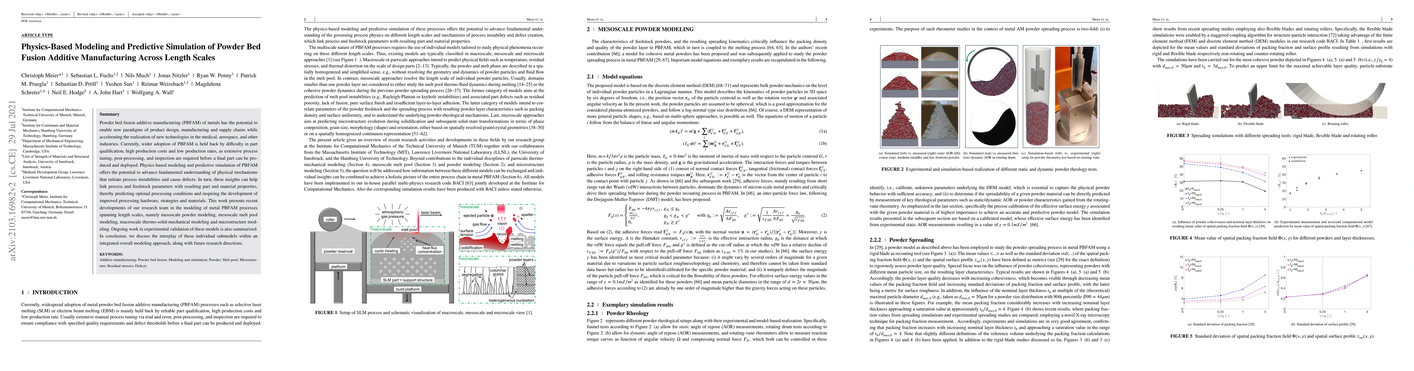 This paper explores physics-based modeling and predictive simulation to advance understanding of powder bed fusion additive manufacturing (PBFAM) across various length scales, aiming to optimize processing conditions and reduce production costs. The research covers mesoscale powder and melt pool modeling, macroscale thermo-solid-mechanical modeling, and microstructure modeling, with ongoing experimental validation efforts.