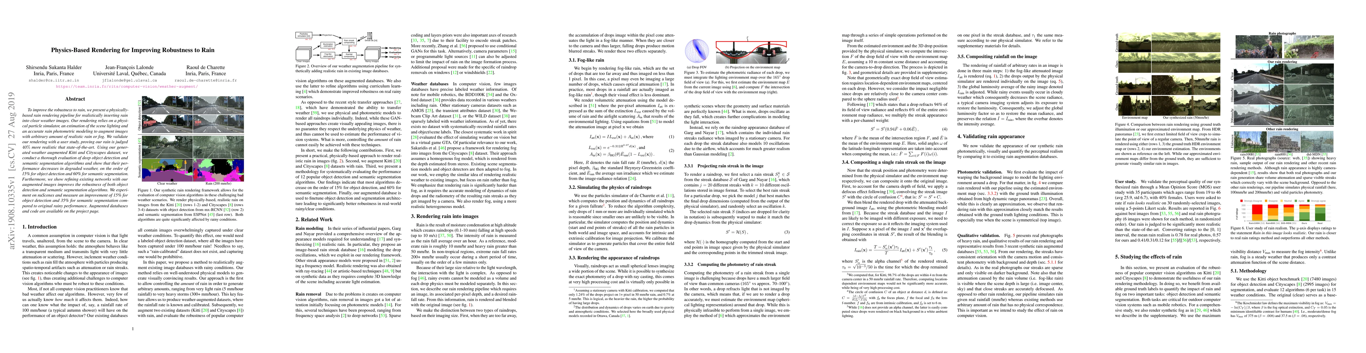 This paper introduces a physics-based rain rendering pipeline to enhance robustness to rain in computer vision tasks. The method improves object detection and semantic segmentation performance in degraded weather conditions by augmenting datasets with realistic rain effects.