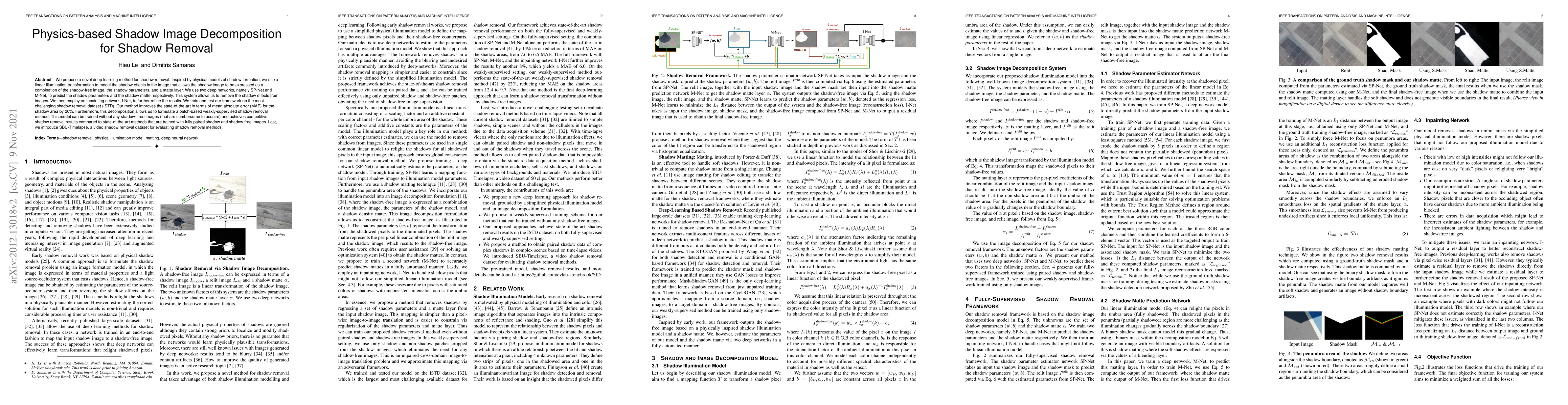 This paper presents a physics-based deep learning method for shadow removal using a linear illumination transformation to decompose shadow images, employing SP-Net and M-Net for parameter and matte prediction, and an I-Net for inpainting, achieving a 20% improvement in RMSE on the ISTD dataset and competitive results in weakly-supervised training.