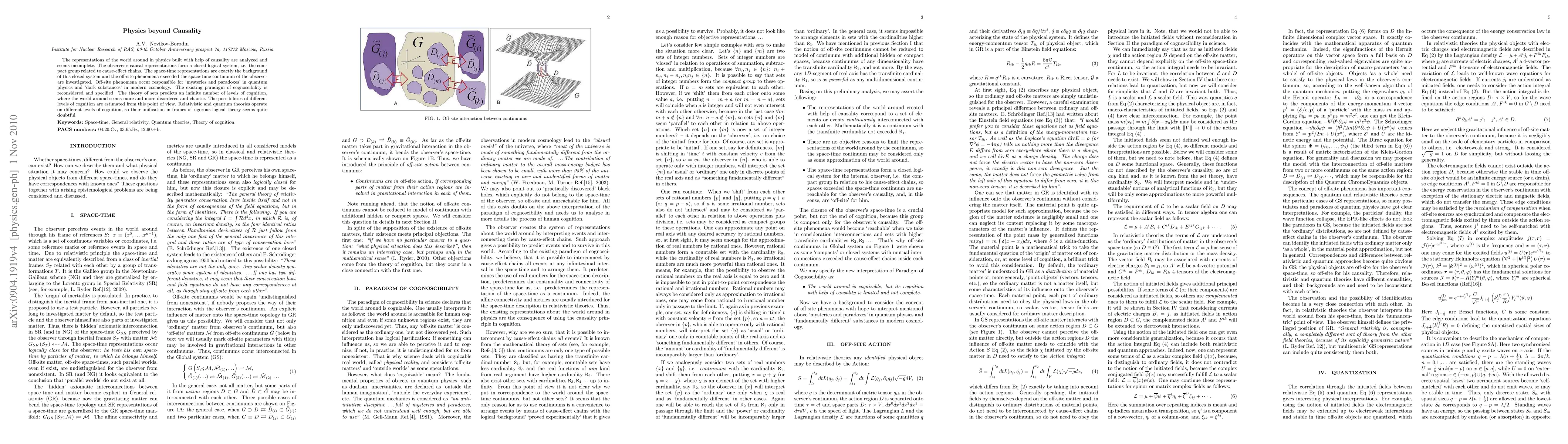 The representations of the world around in physics built with help of causality are analyzed and seems incomplete. The observer's causal representations form a closed logical system, i.e. the compact group related to cause-effect chains. The space-time representations are exactly the background of this closed system and the off-site phenomena exceeded the space-time continuum of the observer are investigated. Off-site phenomena occur responsible for `mysteries and paradoxes' in quantum physics and `dark substances' in modern cosmology. The existing paradigm of cognoscibility is reconsidered and specified. The theory of sets predicts an infinite number of levels of cognition, where the world around seems more and more disordered and chaotic. The possibilities of different levels of cognition are estimated from this point of view. Relativistic and quantum theories operate on different levels of cognition, so their unification in frames of rigorous logical theory seems quite doubtful.