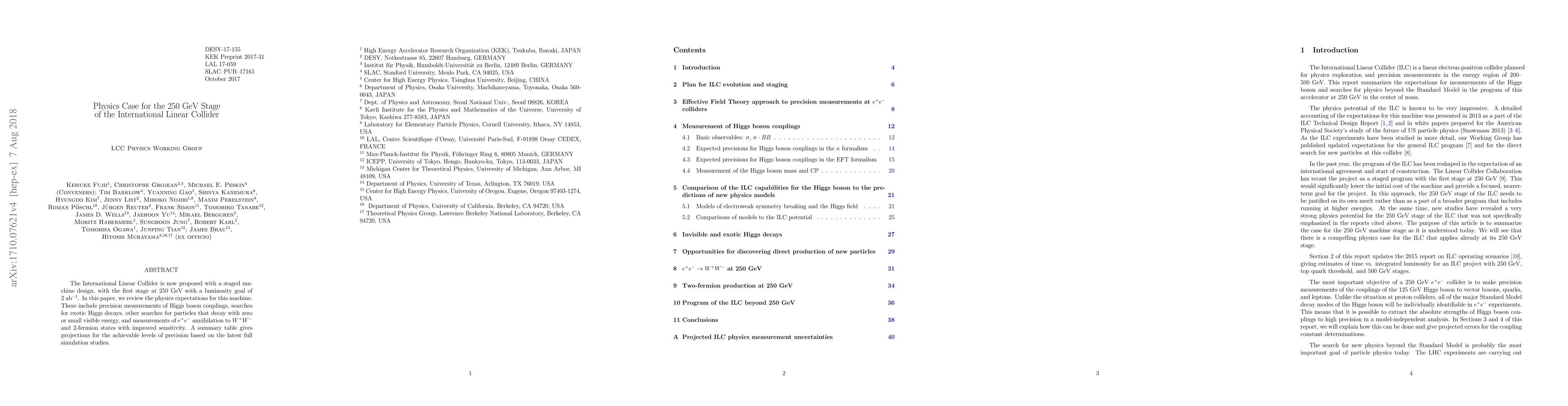 The International Linear Collider is now proposed with a staged machine design, with the first stage at 250 GeV with a luminosity goal of 2 ab-1. In this paper, we review the physics expectations for this machine. These include precision measurements of Higgs boson couplings, searches for exotic Higgs decays, other searches for particles that decay with zero or small visible energy, and measurements of e+e- annihilation to W+W- and 2-fermion states with improved sensitivity. A summary table gives projections for the achievable levels of precision based on the latest full simulation studies.