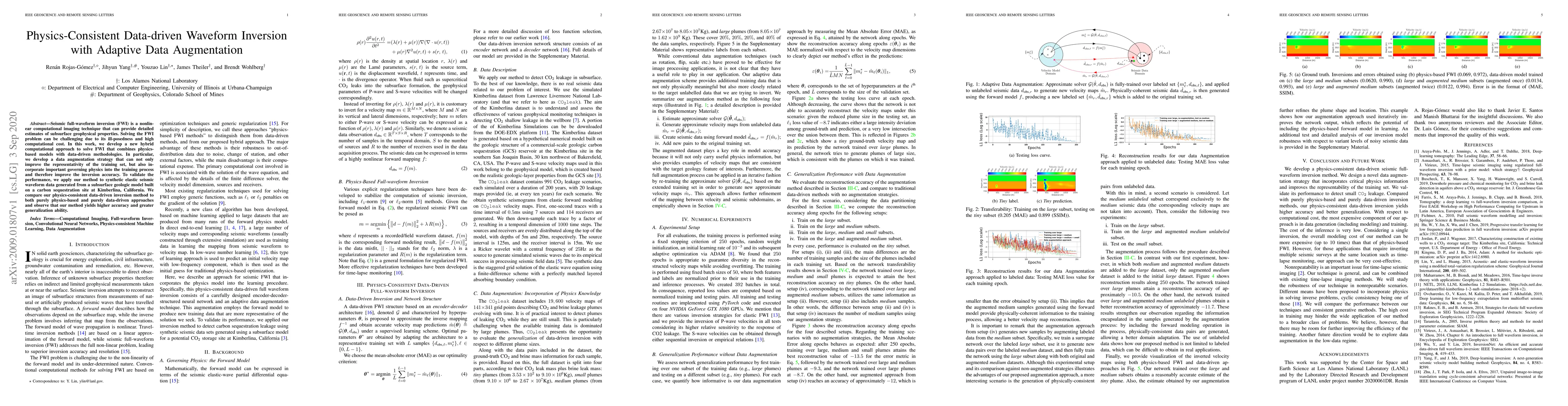 This paper introduces a hybrid approach combining physics-based models with data-driven methods for seismic full-waveform inversion, enhancing training data through adaptive augmentation to improve inversion accuracy and generalization. The method is validated on synthetic seismic data from a carbon sequestration site, demonstrating superior performance compared to purely physics-based or data-driven methods.